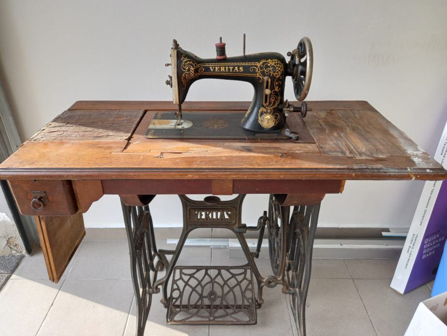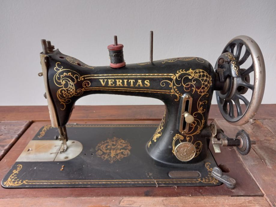 Prodajem staru šivaću mašinu marke Veritas. Kad se preokrene, automatski se pospremi u kućište, a tako se dobiva radna ploha koja može poslužiti kao stol.Potrebno je urediti furnir.