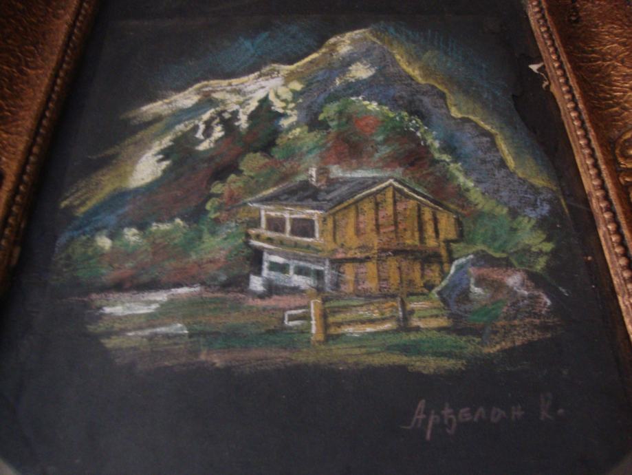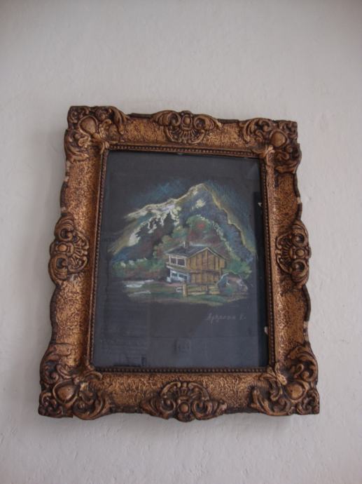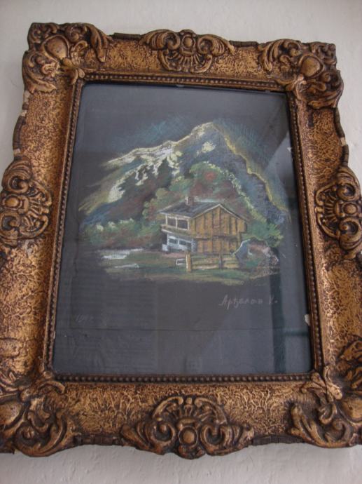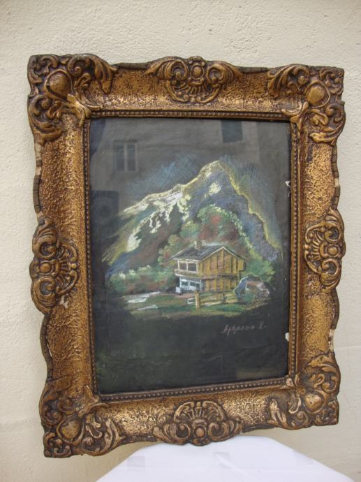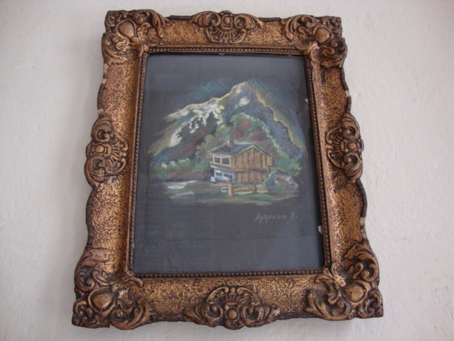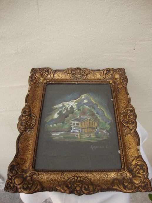 Predivni rad u pastelu ,planinski motiv sa kolibom u predivnom zlatnom starom drvenom okviru