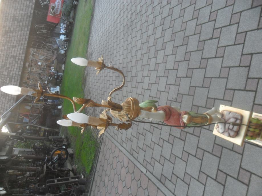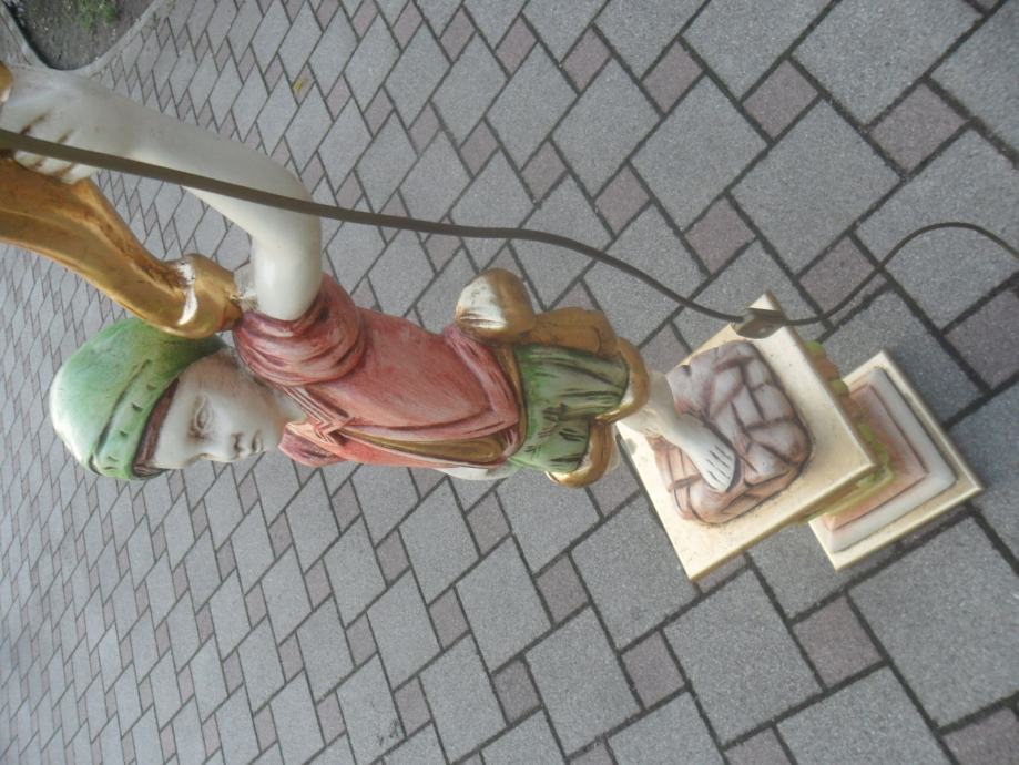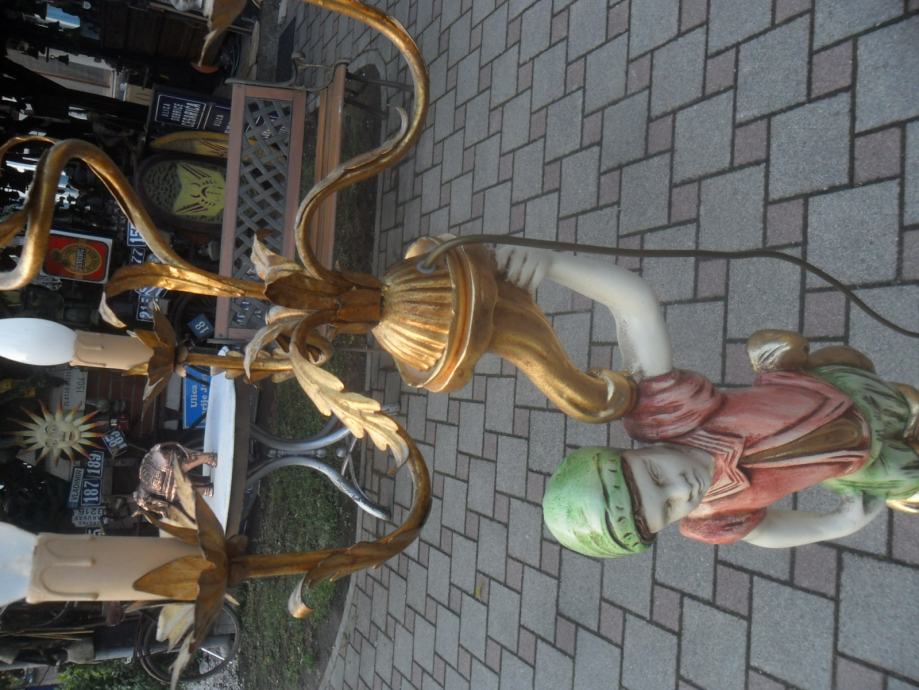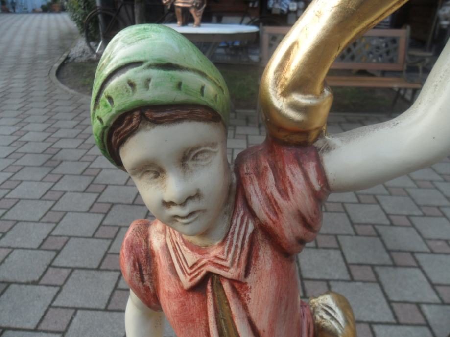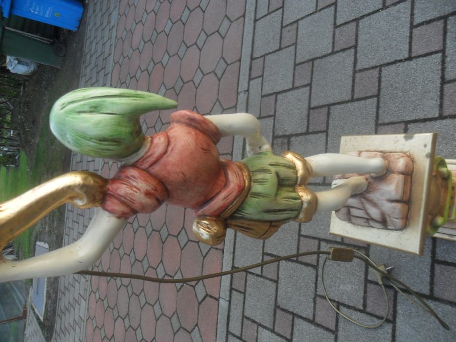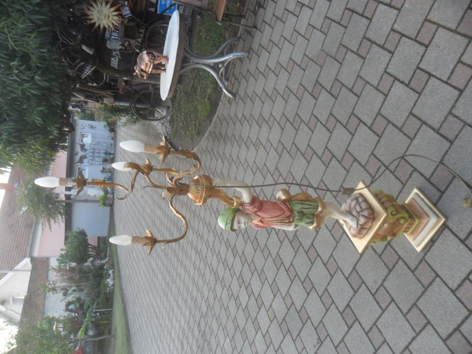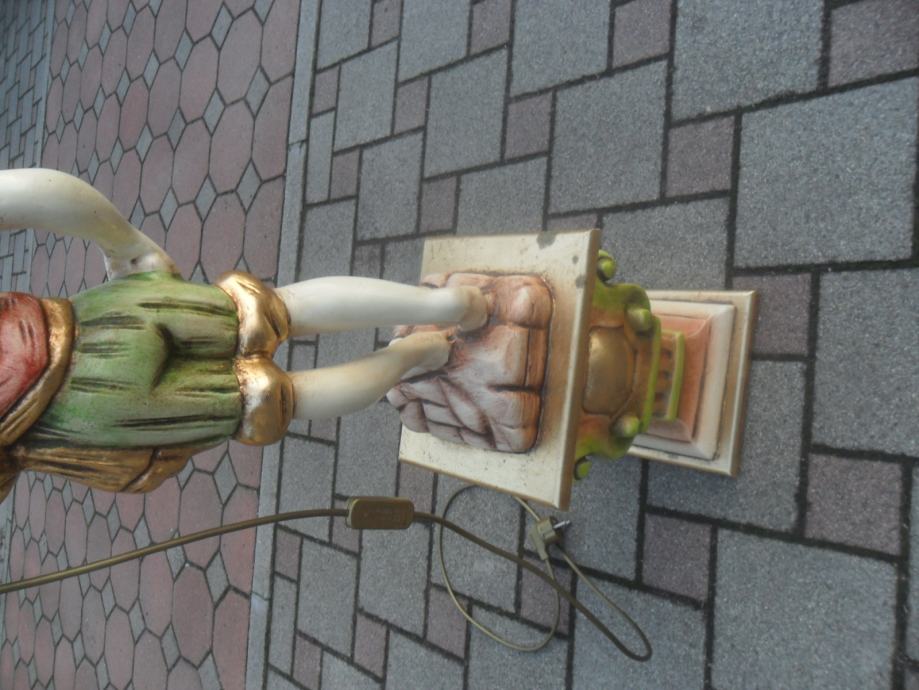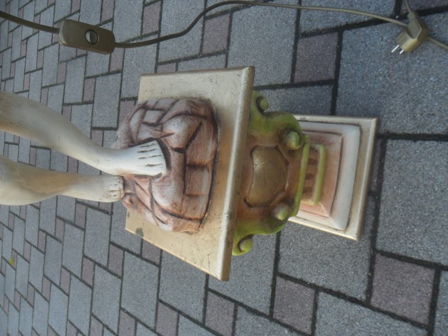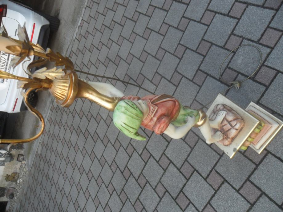 prekrasna i jako dekorativna,bez oštečenja,potpuno ispravna,izrađena u kombinaciji metala,drveta,a sama skulptura dječaka je od meni nepoznatog materijala(kažu poznavaoci da je prirodna smola,,neki mljeveni kamen,no nabolje sami vidjet,,maximalna visina sa sijalicom je 160cmm..pogledajte moje ostale oglase starina i antikviteta gdje ima još lampi