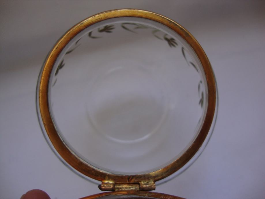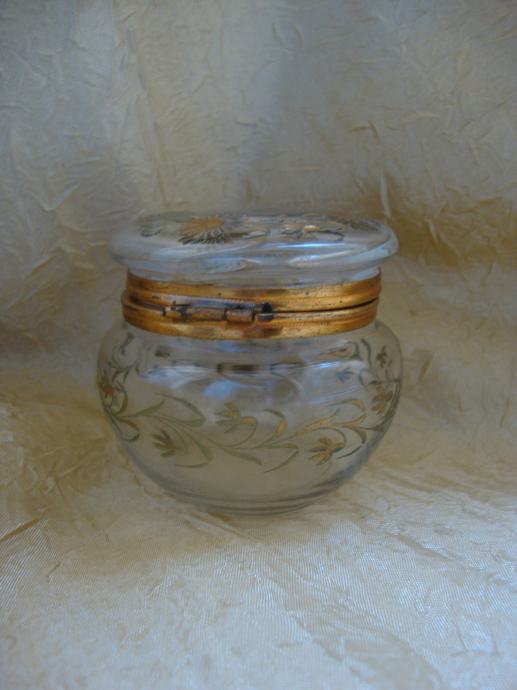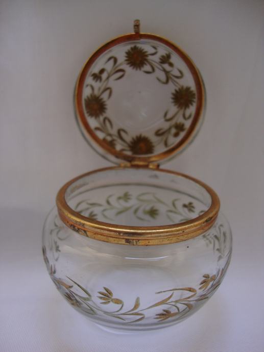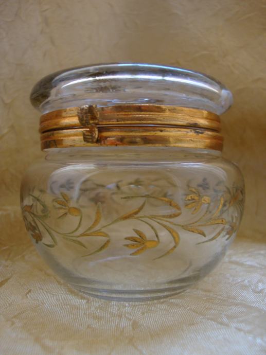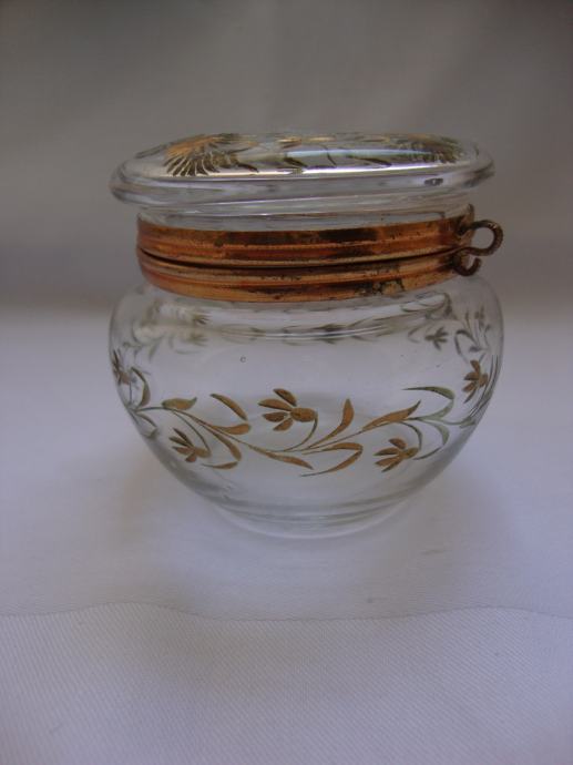 Stara damska secesijska posuda sa poklopcem reljefno brušeno puhano staklo sa pozlatom cvijetni dezen na poklopcu i boćno na posudi ručno oslikano - obruč pozlaćeni mesing - Bohemia