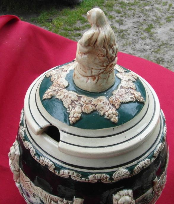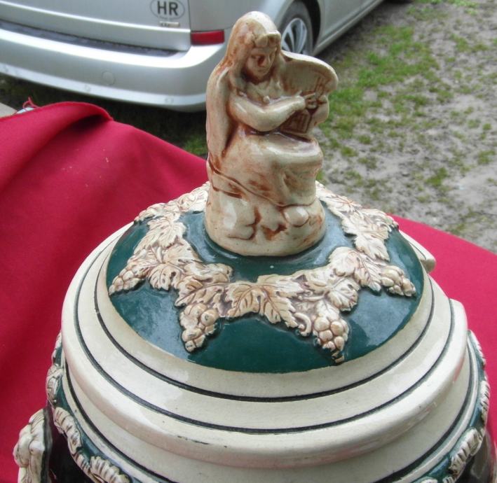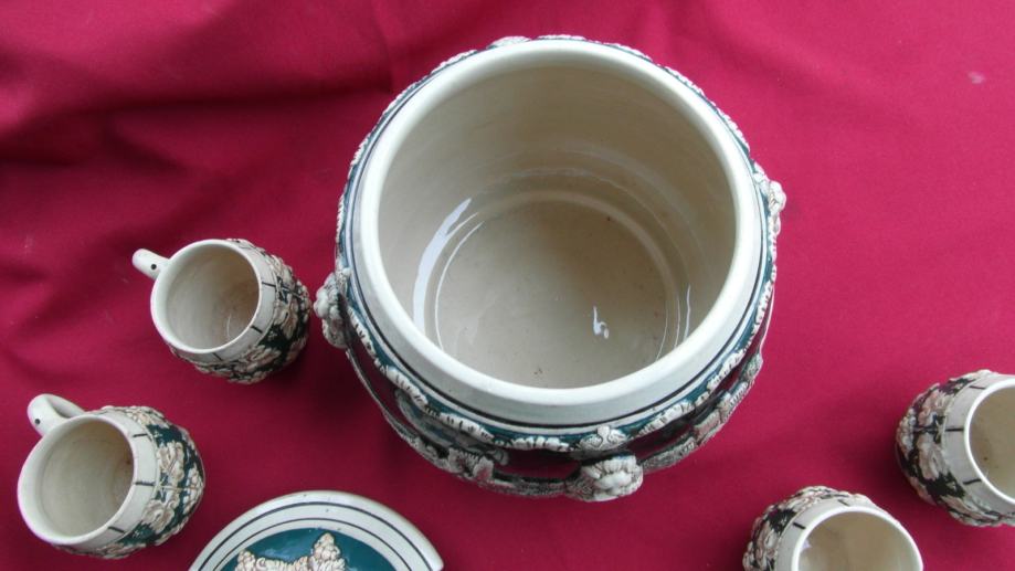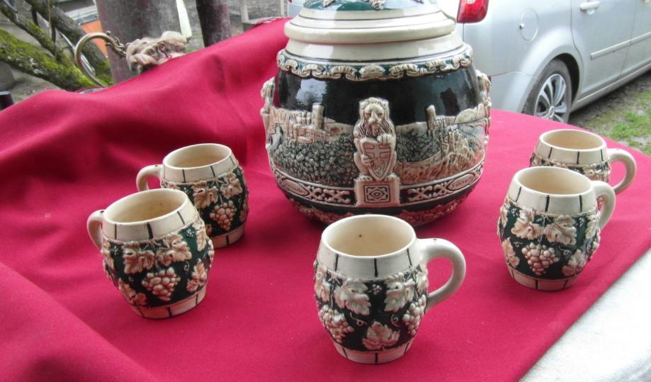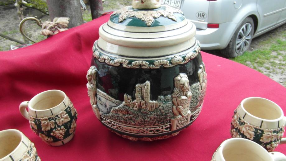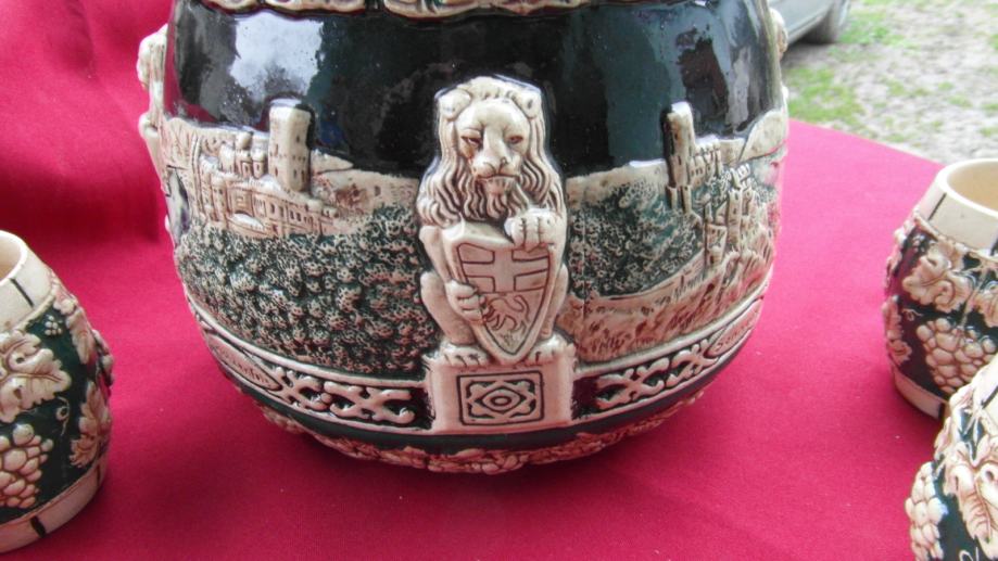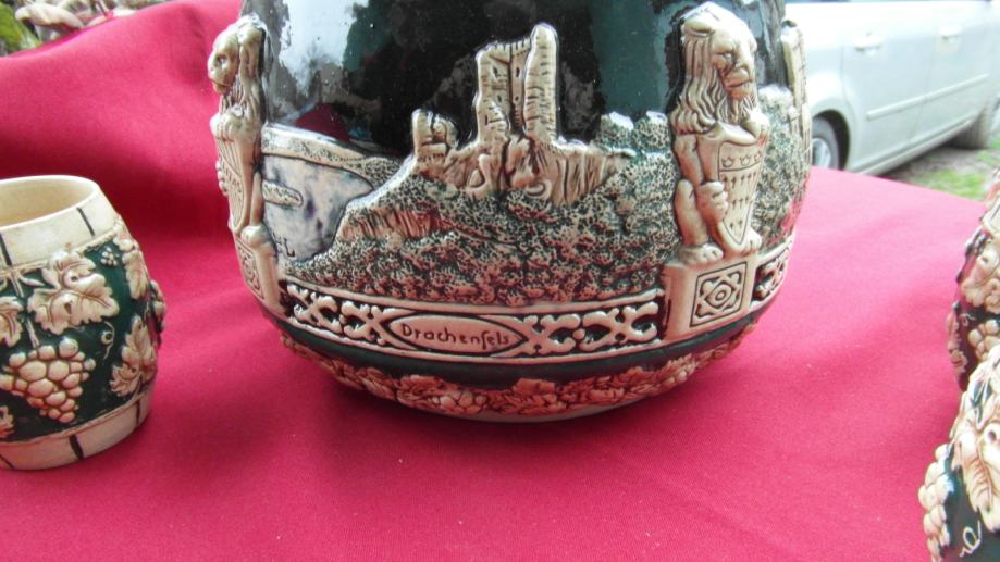 Čaše su dimenzija 8 x 7,5 cm, a posuda je 19 x 21 cm. Motiv je stara utvrda u mjestu Drachenfels u visoravni Siebengebirge između Königswintera i Bad Honnefa u Njemačkoj. Brdo je nastalo dizanjem magme koja se nije mogla probiti na površinu, a zatim se ohladila i postala čvrsta ispod. Predmet je mnogo turizma i romantizma u području Sjeverne Rajne-Vestfalije. Tu su i simboli lavova sa štitom Na poklopcu je djevojka sa harfom.
