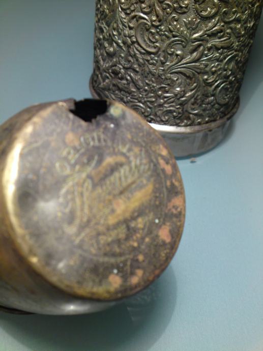 Napomena: poklopac je malo oštećen, no kompletna boca je očuvana izvana i iznutra.