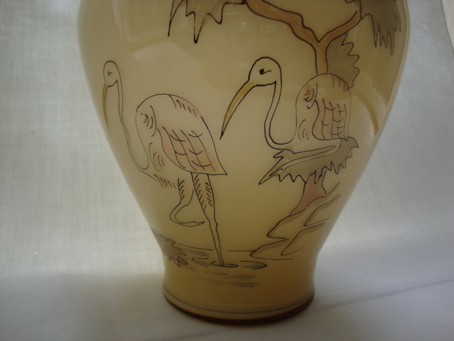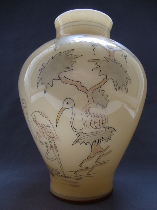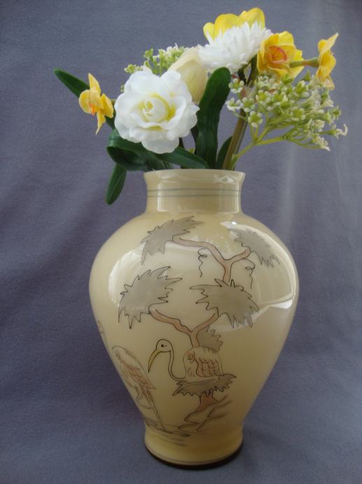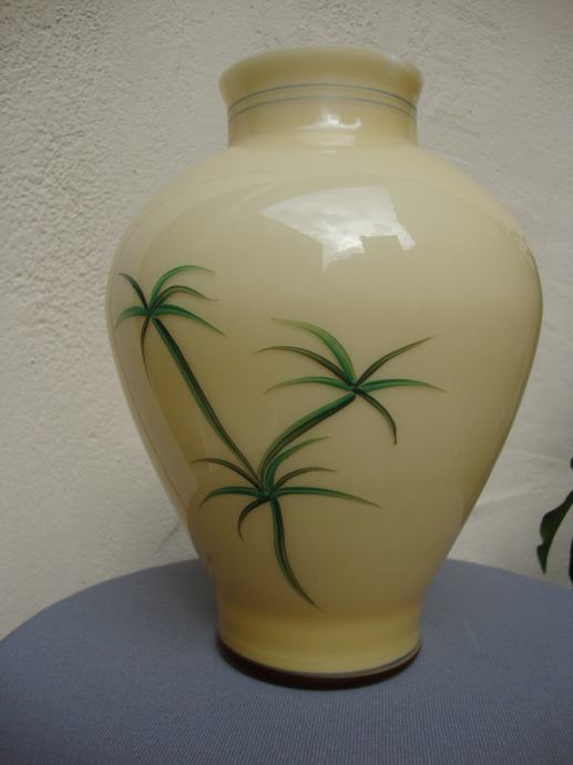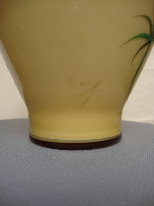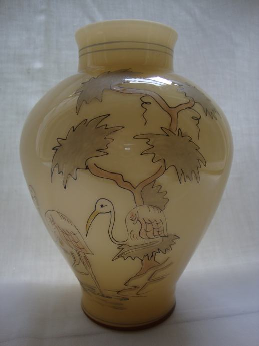 Predivna staklena vaza od mlječnog stakla bež boje ručno oslikana -potpis je nerazgovijetan
