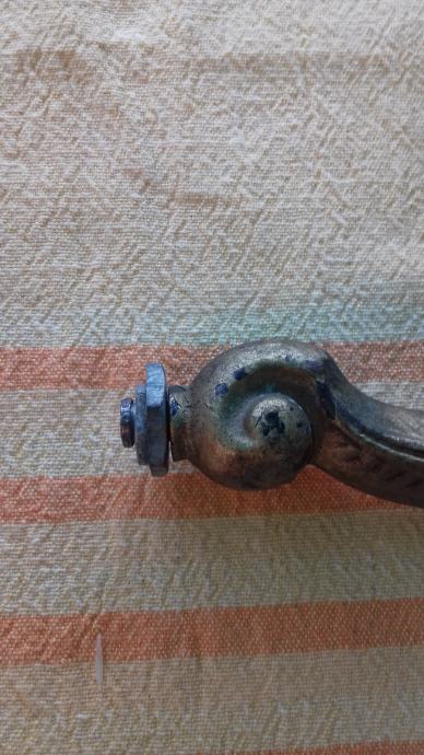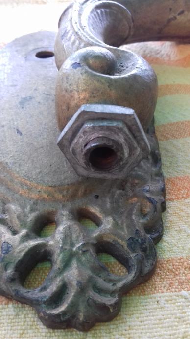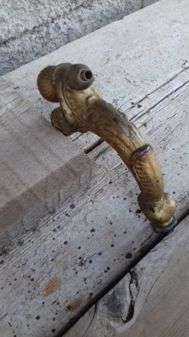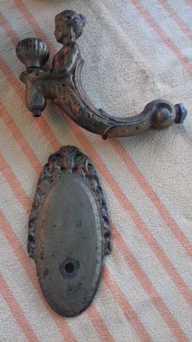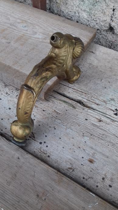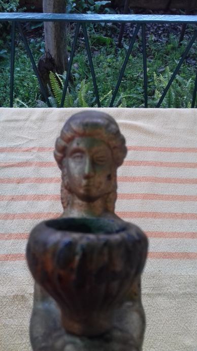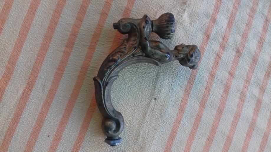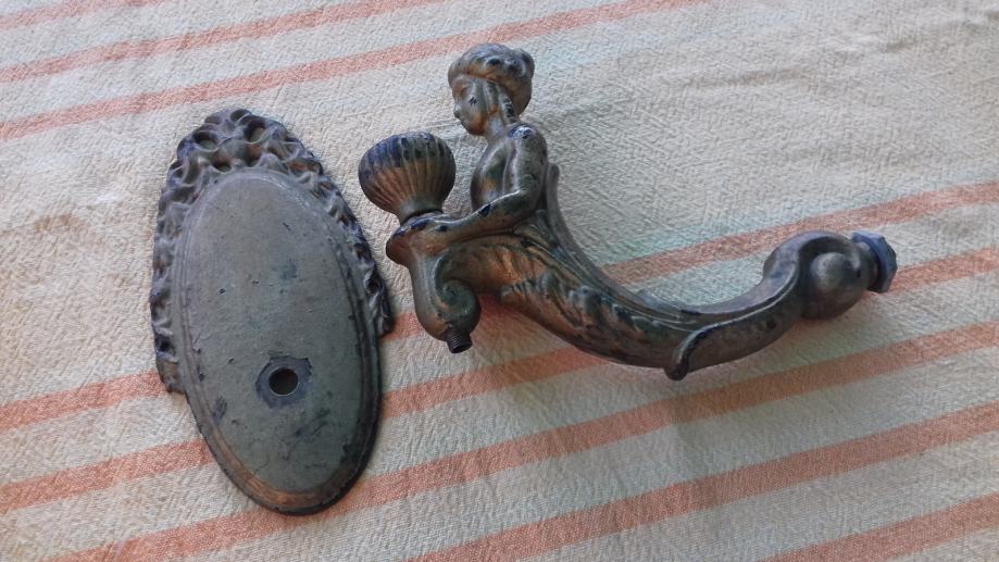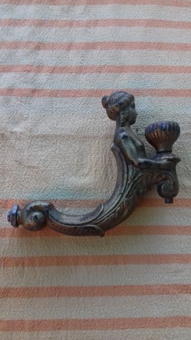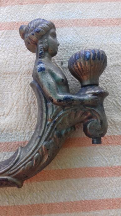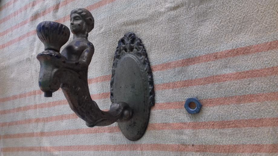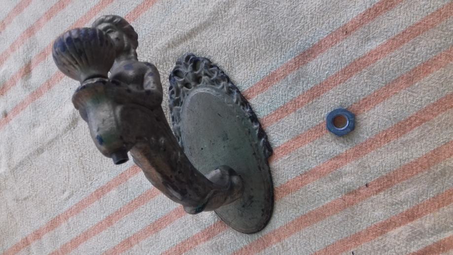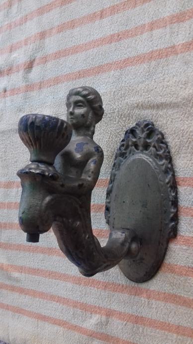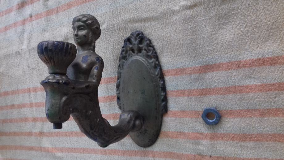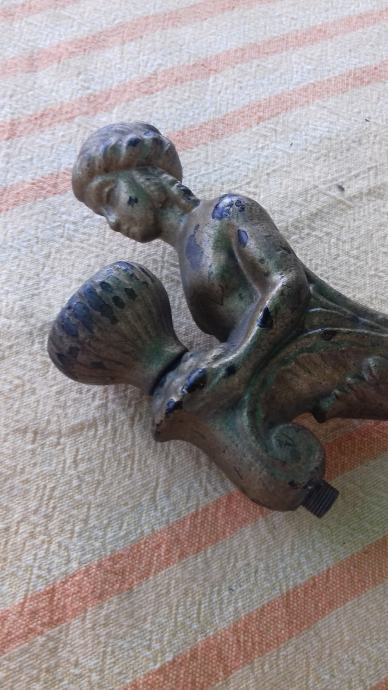 Prodaje se stara zidna mesingana lampa u obliku stilizirane žene. Lampa je moguće iz razdoblja početka elektrifikacije, stilski je izrađena u mogućem historicističkom ili secesijskom stilu. Sama lampa se sastoji od mesinganog ovalnog podloška na koji se montira uvijeni mesingani element sa stiliziranim poprsjem žene koja drži element u obliku stilizirane vaze koji je napravljen moguće od kositra, cinka ili aluminija. U navedeni element stilizirane vaze se nekada moguće montirala žarulja i u unutrašnjosti je potpuno gladak a na dnu njega postoji otvor, te se spaja sa otvorom sa vanjskim navojima na donjoj strani elementa sa stiliziranim poprsjem žene kroz koji je nekada moguće prolazio električni kabel. Ova stara lampa se od strane prodavatelja prodaje isključivo u kolekcionarske i dekoracijske svrhe jer prodavatelj ne zna na koji način je bila sprovedena elektrifikacija na njoj. Iz tog razloga napominje se od strane prodavatelja potencijalnim kupcima da ukoliko žele elektrificirati lampu da to onda oni čine na vlastitu odgovornost zbog opasnosti koju može izazvati električna struja, odgovornost od koje se prodavatelj ograđuje jer predmet prodaje samo kao kolekcionarski ili dekoracijski predmet, a ne kao funkcionalnu lampu, te se ista lampa iz gore navedenih razloga prodaje kao neispravna i oštećena. Također, navoji matice i matice koji bi trebali držati element nosača lampe i element stilizirane lampe čine da oba elementa vrlo slabo prijanjaju jedan uz drugi što ih čini potpuno nestabilnim za montažu bilo međusobno, bilo na neku površinu pa se lampa prodaje kao oštećena i neispravna i iz ovih razloga. Iz svih naprijed navedenih razloga lampa se od strane prodavatelja prodaje isključivo kao neispravna i oštećena. Dimenzije spojenih elemenata lampe su: dužina cca 19,5 cm i visina cca 19, 5 cm. Cijena lampe je 332 eura. Mogućnost osobnog preuzimanja u Zadru. Kontakt broj mobitela 091 131 10 36.