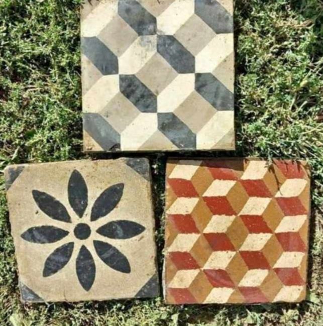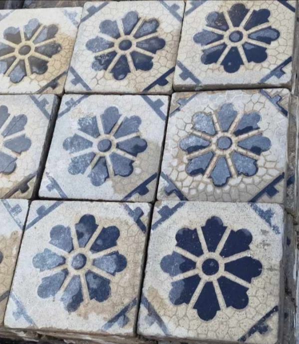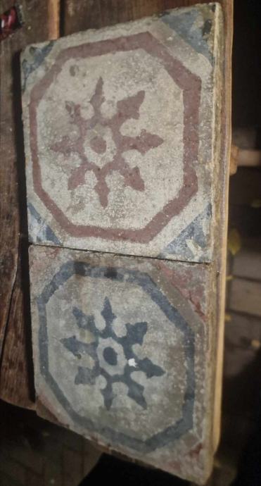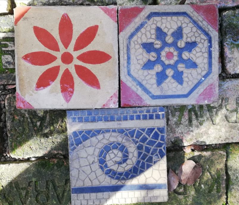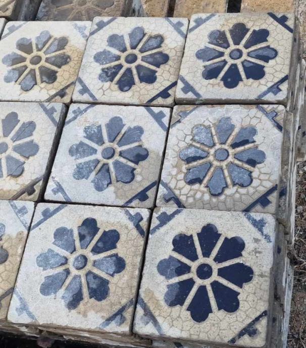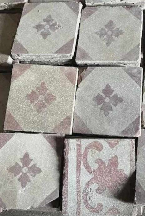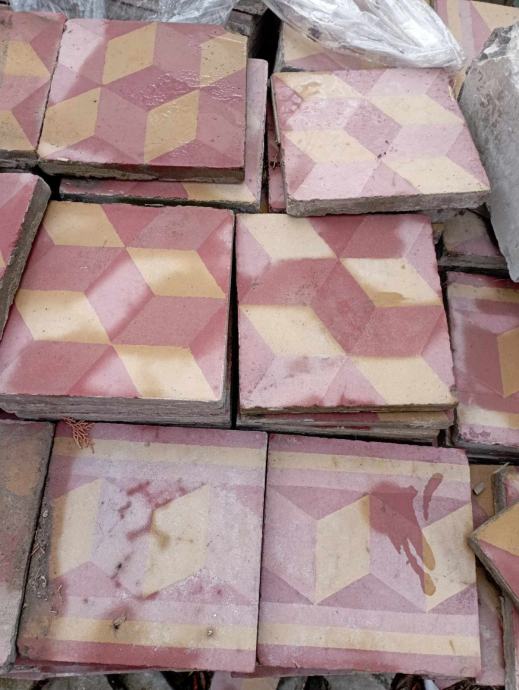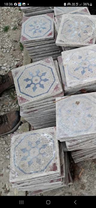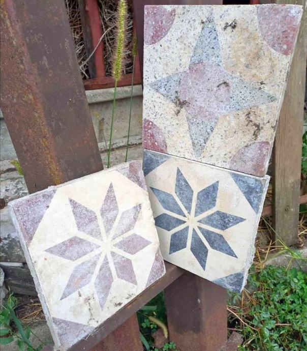 Stare podne keramičke pločice. Količina ograničena, cca. 10 - 12 m2 po dezenu. Različiti dezeni. Mogućnost kombinacije više dezena. Širina 20 x 20 cm. Debljina : 2-3 cm. Težina po pločici cca 2 kg, 1 m2 - cca. 50 kg. U 1 m2 ide 25 komada. Starost:preko 120 godina.