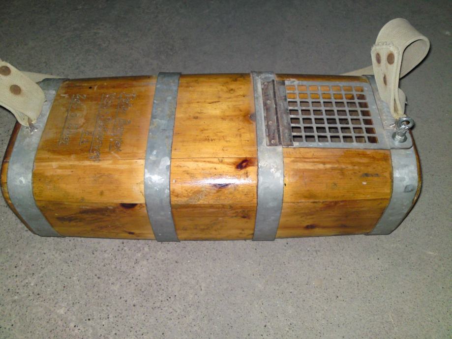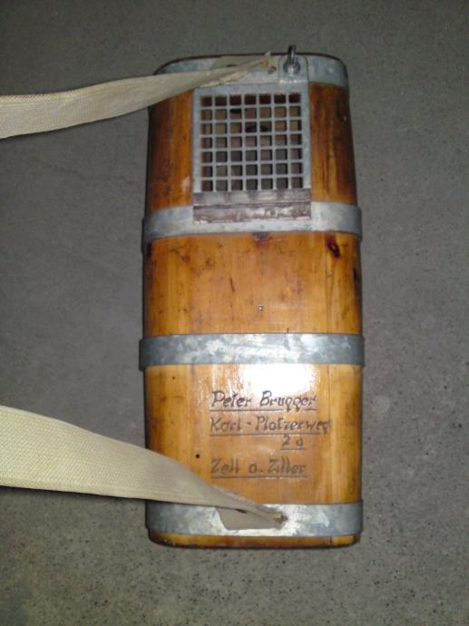 Stari drveni prijenosni kavez za ptice i male životinje, sa gurtnom za nošenje i natpisom izrađivača. Ručni rad starog obrta u odličnom stanju. Dimenzije: dužina: 50,0 cm x dubina: 21,0 cm x visina: 17,5 cm.