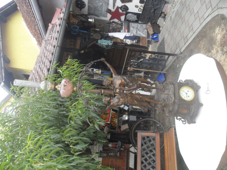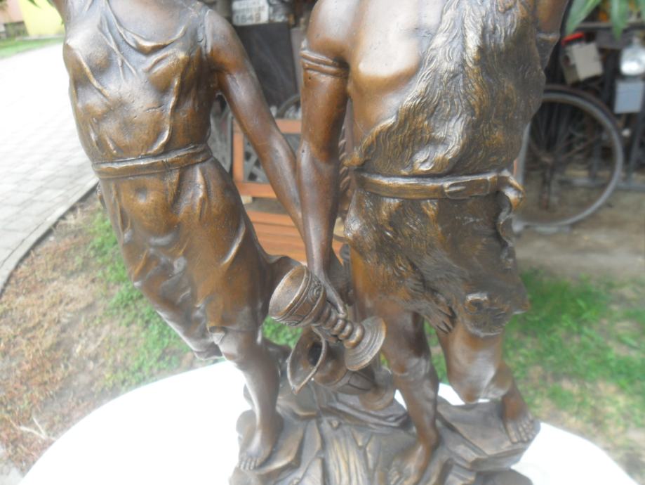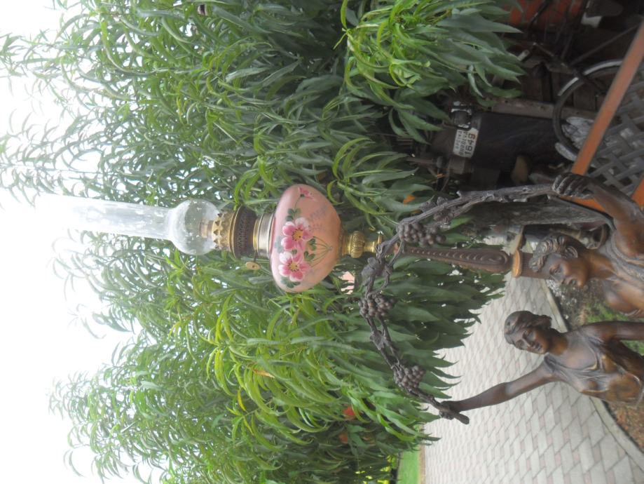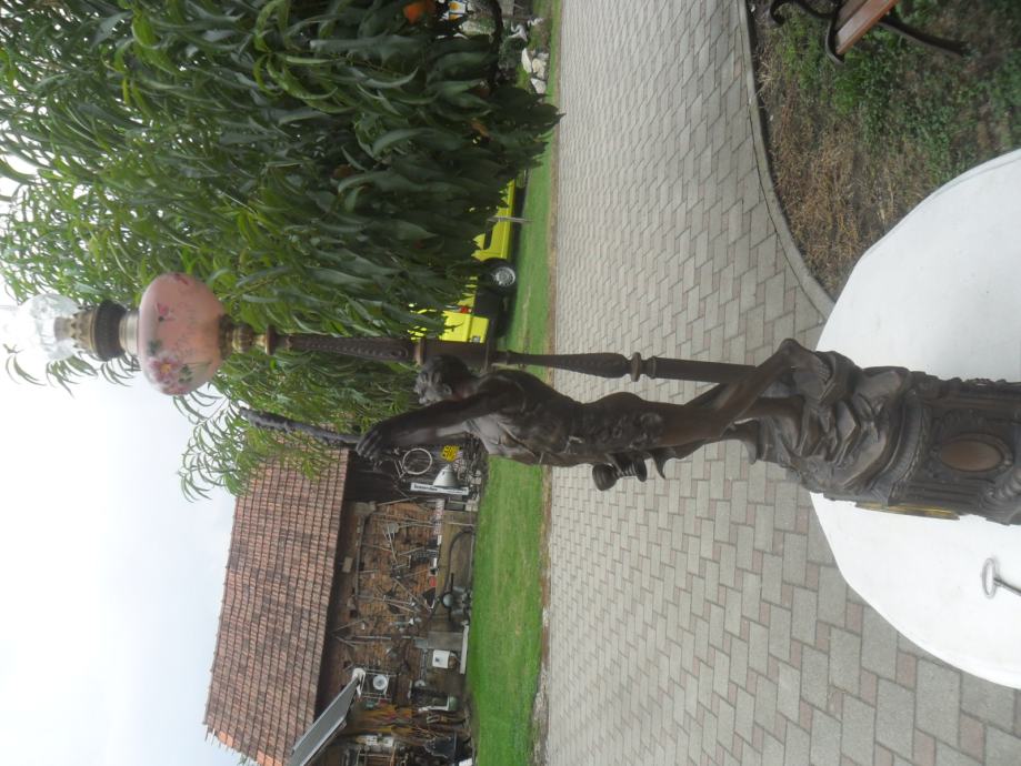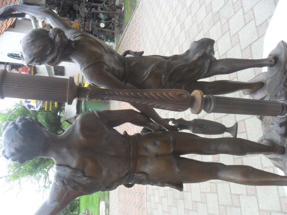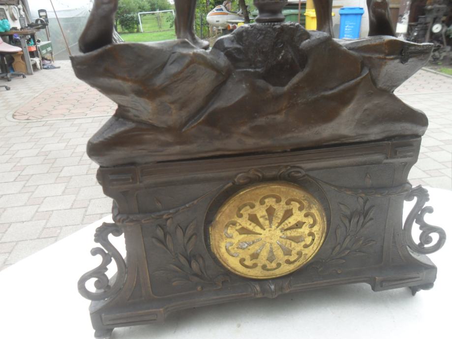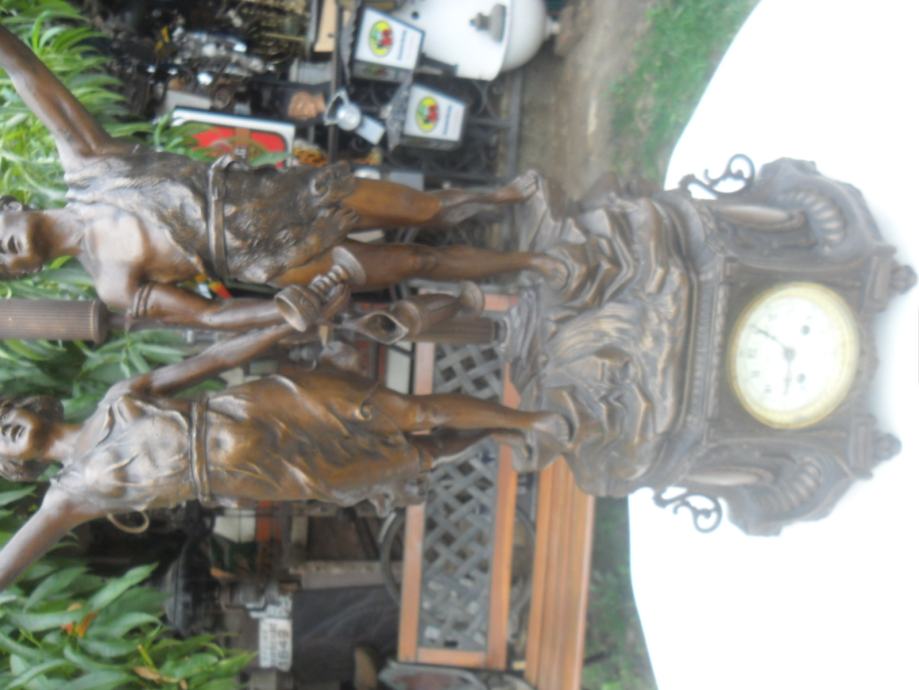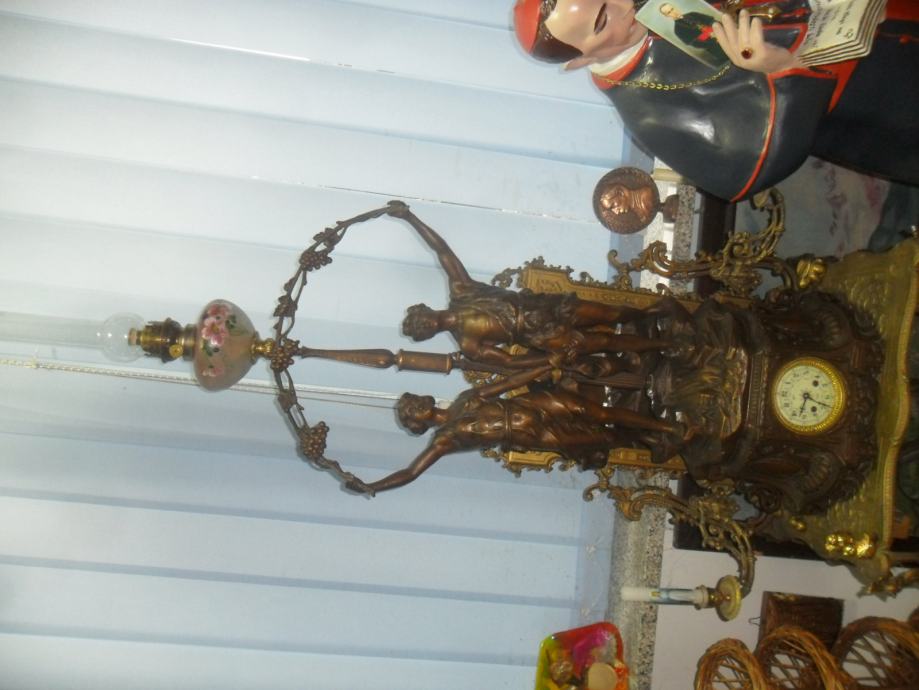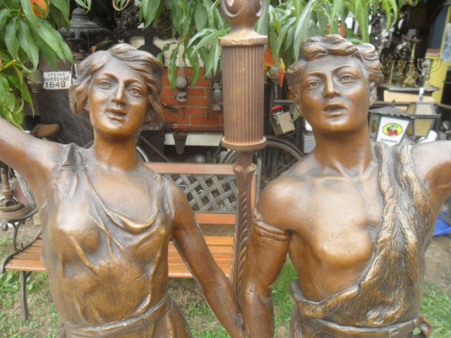 prekrasan,dekorativan stari sat,potječe negdje krajem 19 stolječa,petrolejka je potpuno ispravna,sat kuca svakih pola sata i puni sat,,materijal je bronca ,kositar,staklo.ukupna visina sa lampom je 140cm,,širina 35cm,dubina 17cm.visina brončanih ljudi sa lukom cviječa koji drže je 90cm(navodno po nekim poznavaocima su to adam i eva..nešto prekrasno za onog ko voli...pogledajte moje ostale oglase starina i antikviteta