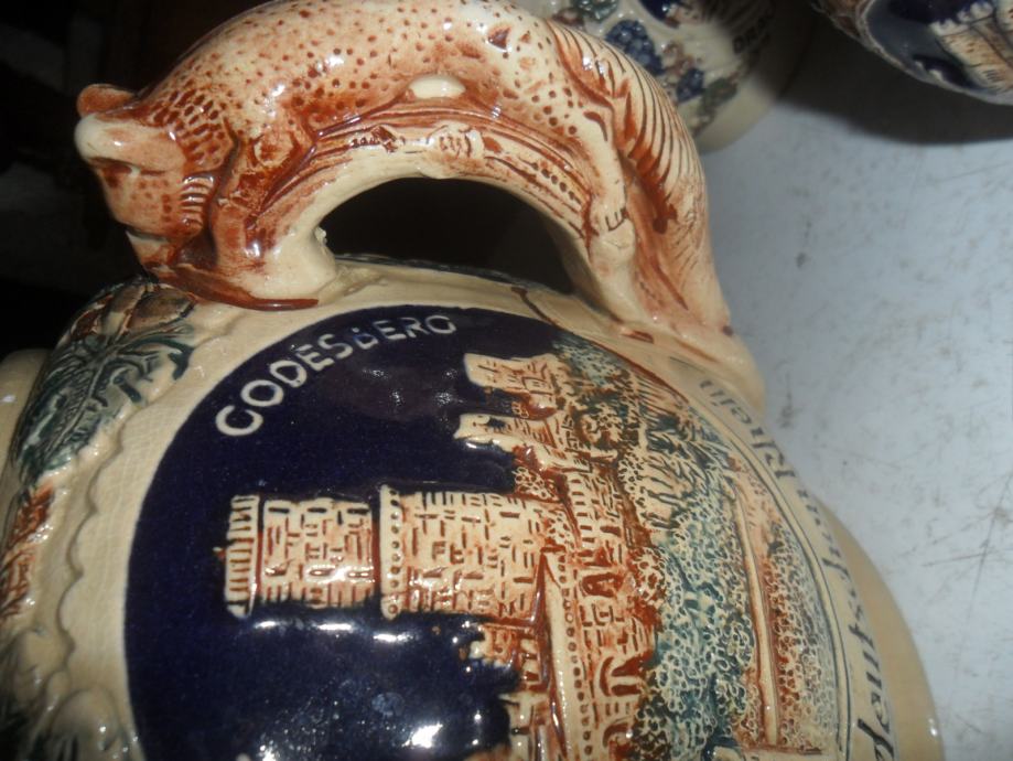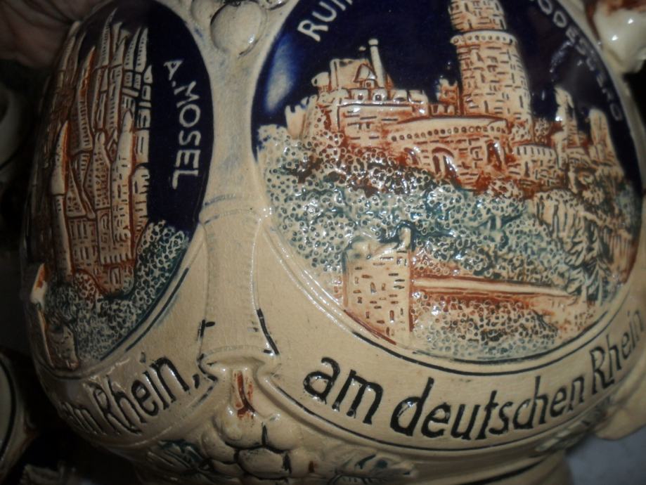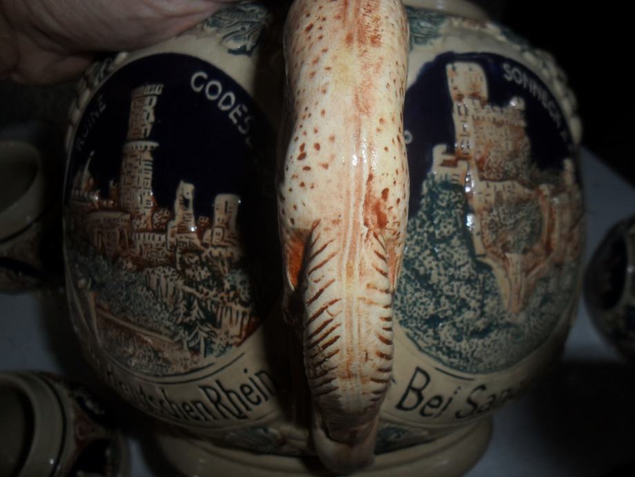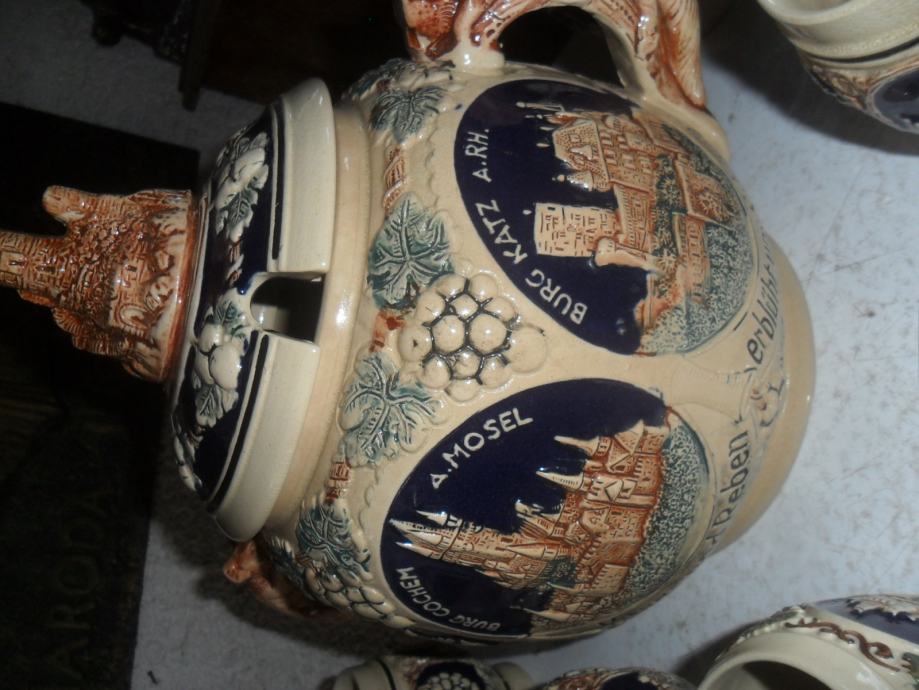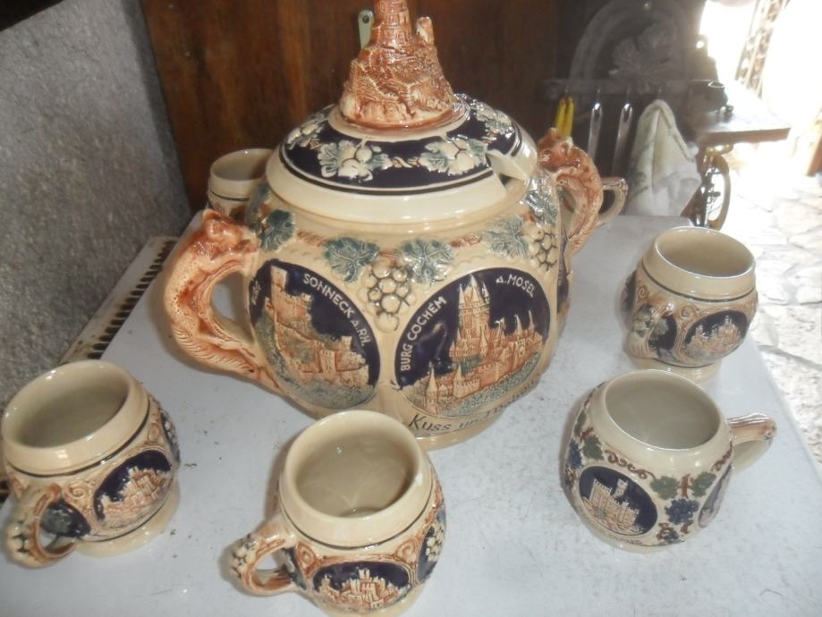 divan,prekrasan njemački keramički set za vino ili čaj i nešto slučno iz 1943(ima žig na podnožju i na slici je),,bez ikakovih oštečenja,,ukupna visina posute sa poklopcom je 30cm,širina sa ručkama 30cm,krigle bez ručki su visine 9cm promjera 9cm...pogledajte i moje ostale oglase starina i antikviteta