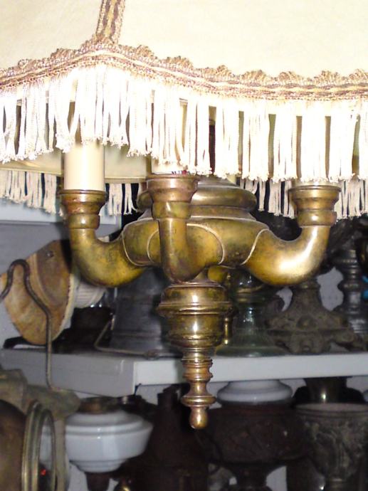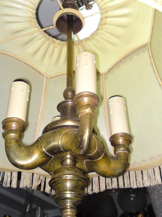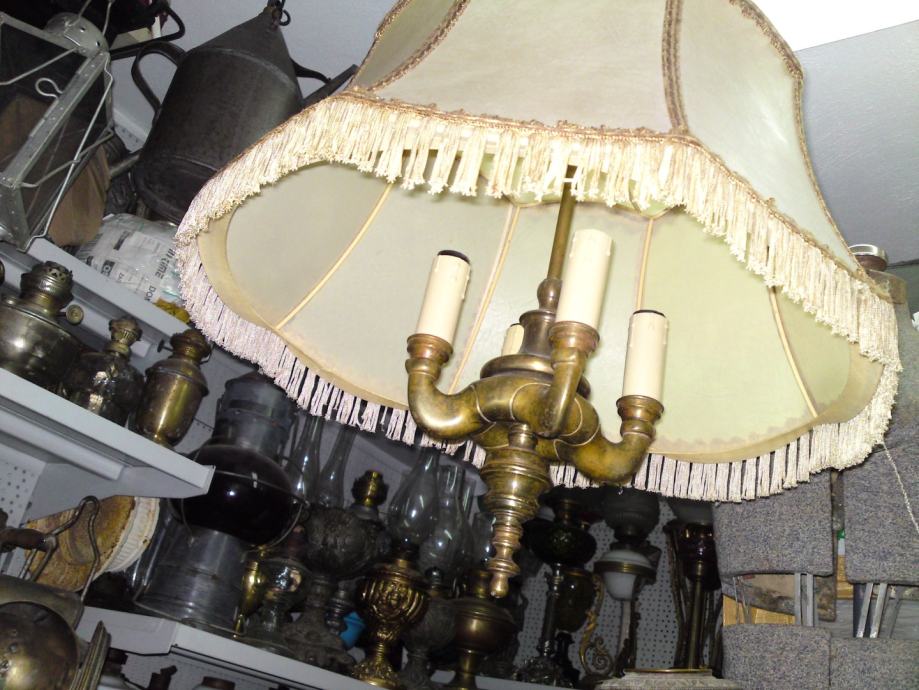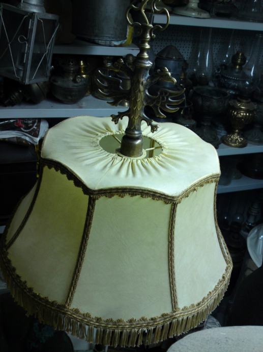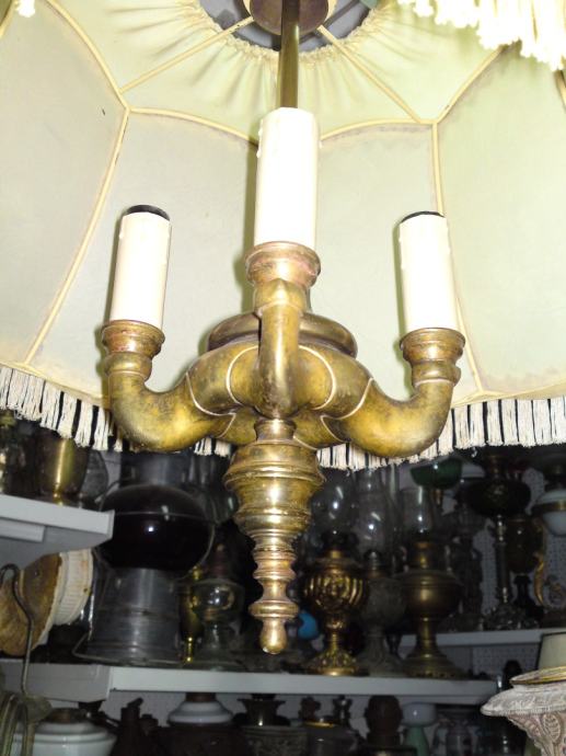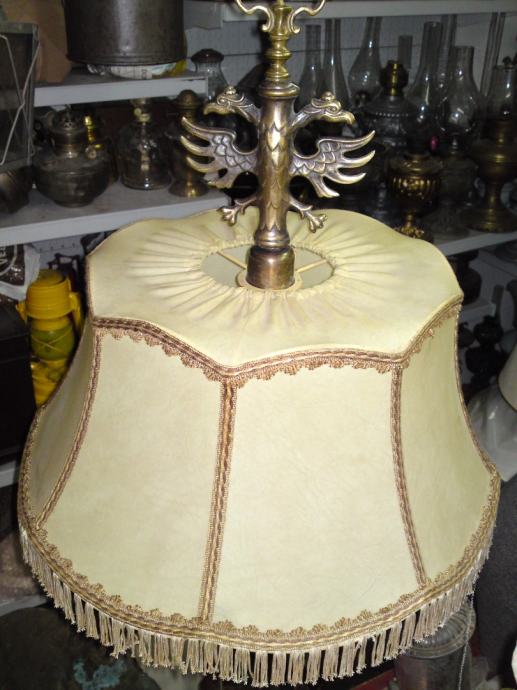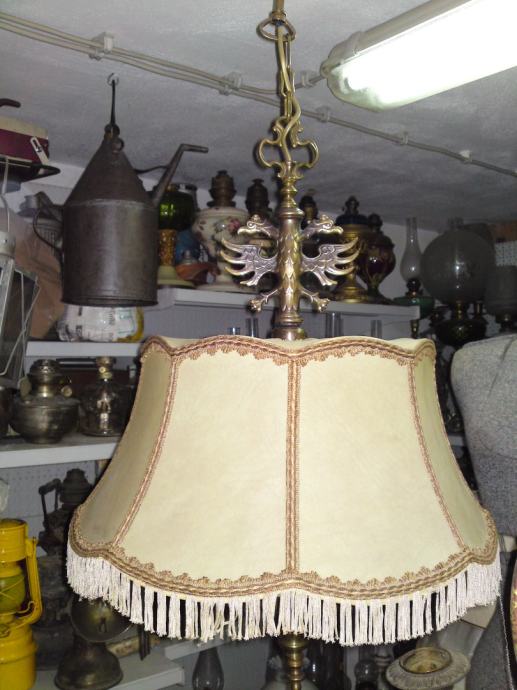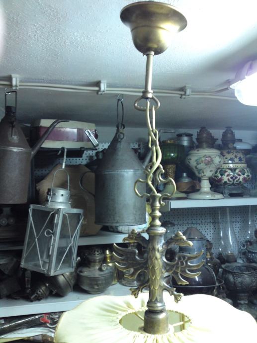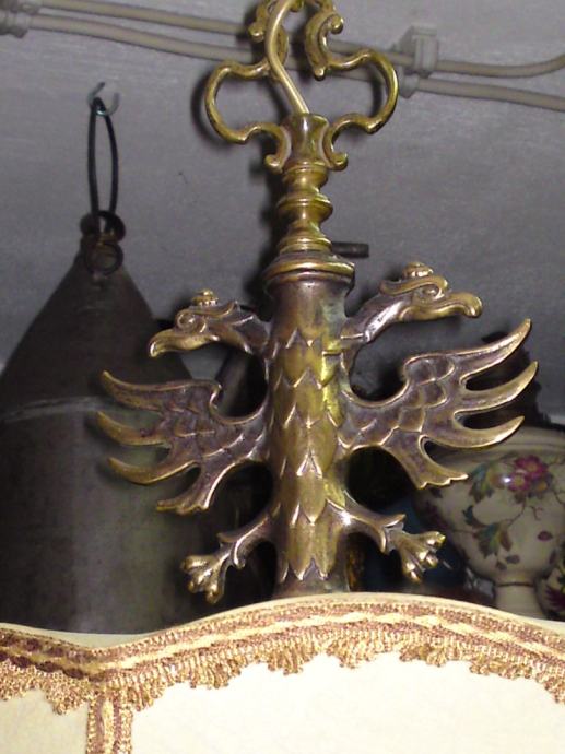 Stari luster sa prijelaza 19/20 stoljeća, sa dvoglavim orlom, podrijetlo. Austro-ugarska; materijal: puni mesing, tkanina; iz privatne kolekcije; u funkciji; stanje. odlično, dimenzije: visina. 88,0 cm, visina orlova. 13,0 cm; visina sjenila. 26,0 cm, promjer sjenila sa donje strane: 45,0 cm.