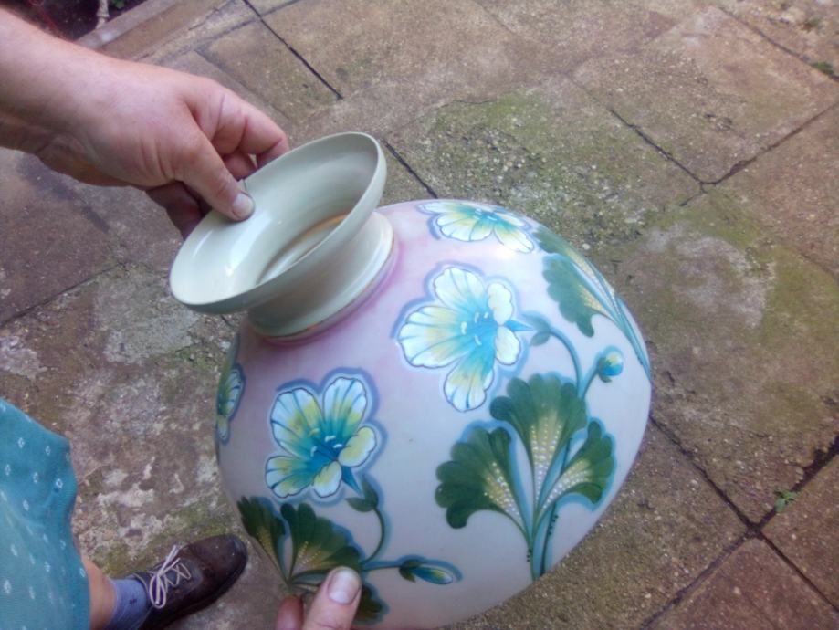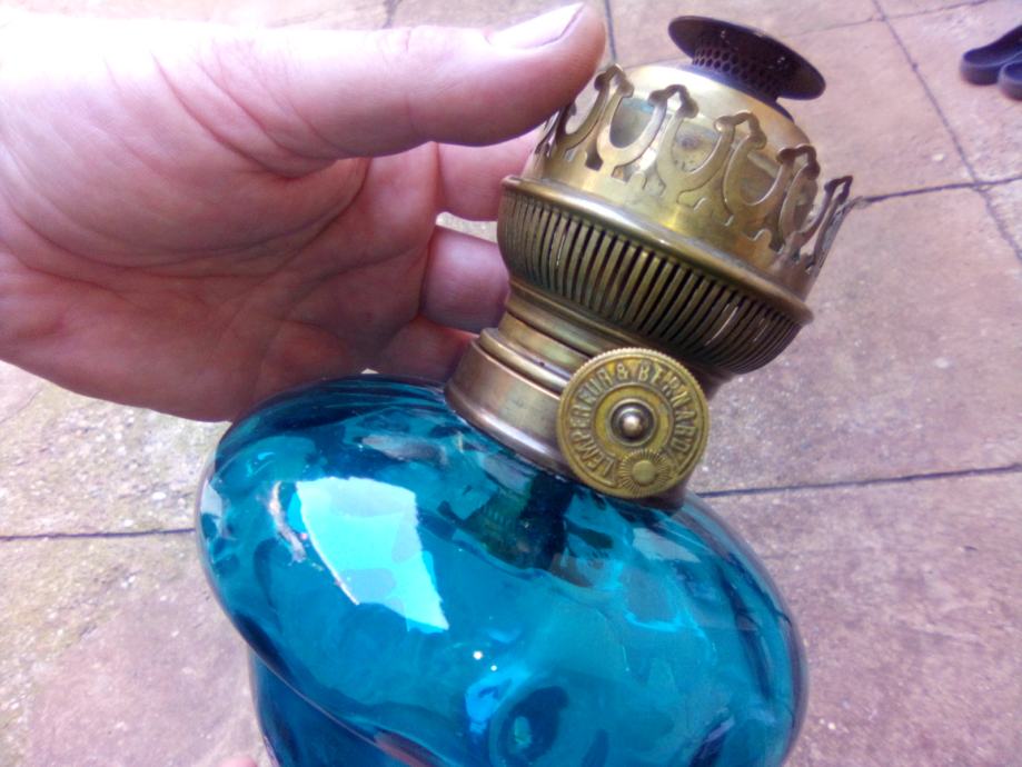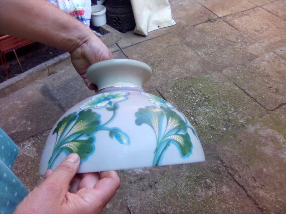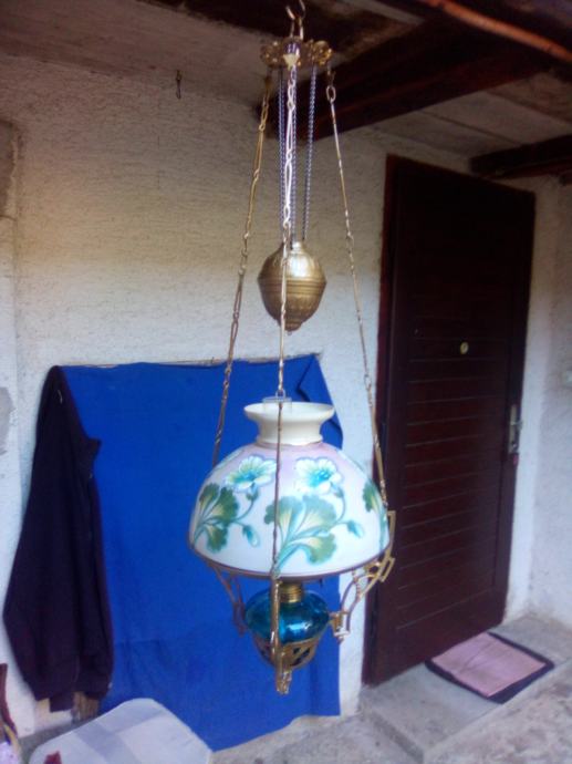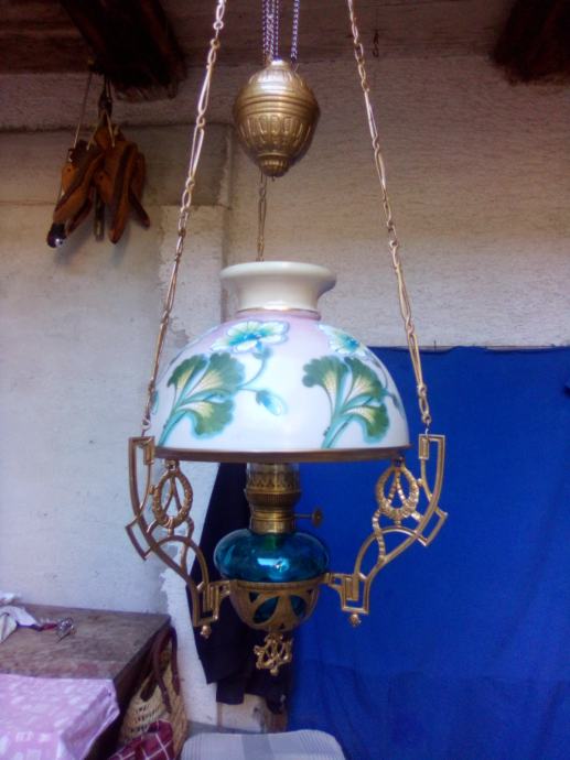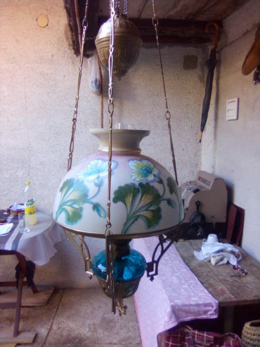 Stari luster petroljka, sa atraktivnim ručno oslikanim širmom promjera 33 cm.