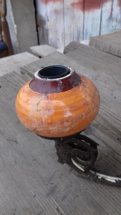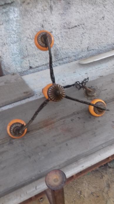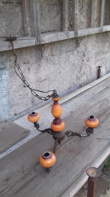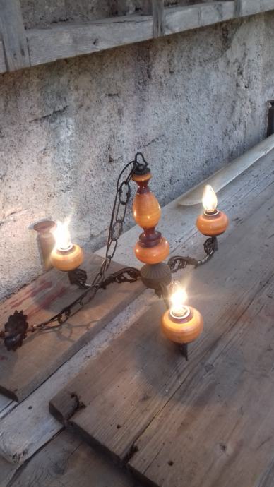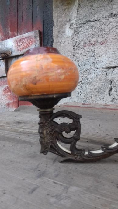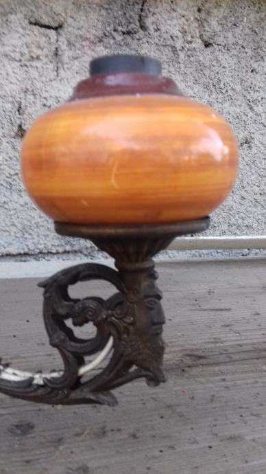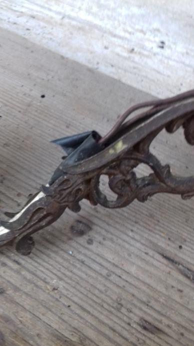 Prodaje se mesingani luster (djelomično sa željeznim dijelovima) sa dekoracijama u obliku stilizirane muške glave s tri keramička rasvjetna tijela za male žarulje. Sve tri žarulje svijetle što je vidljivo na fotografiji. Jedno rasvjetno tijelo je bilo razbijeno ali je sanirano lijepljenjem što se vidi na slikama. Električni vodiči su spojeni sa dva različita dijela žice što se vidi na mjestima na kojima je izolir traka pa treba popravak stručnjaka električara. Razdaljina od jednog do drugog rasvjetnog tijela iznosi cca 43 cm. Mogućnost osobnog preuzimanja u Zadru. Cijena je 46 eura. Kontakt mobitela: 091 131 10 36.