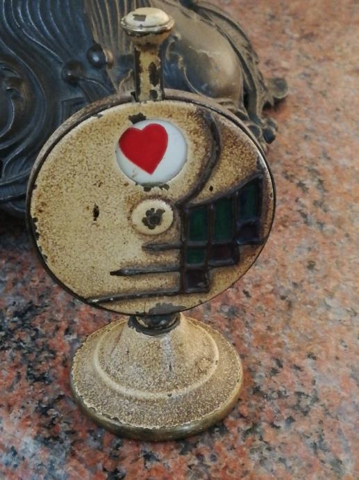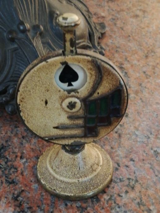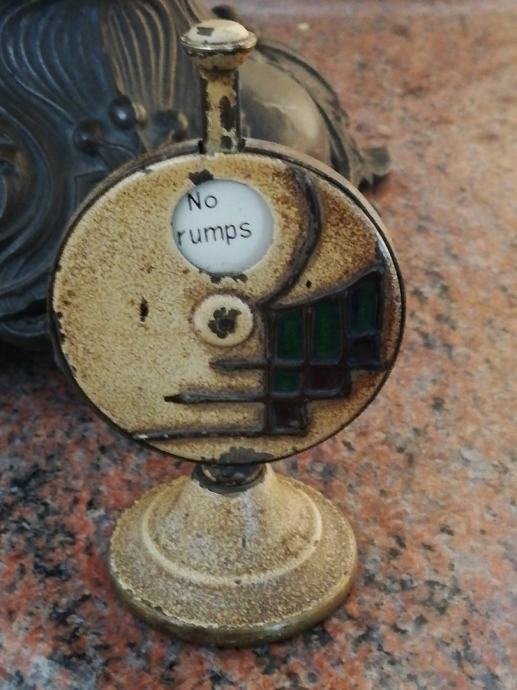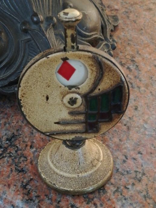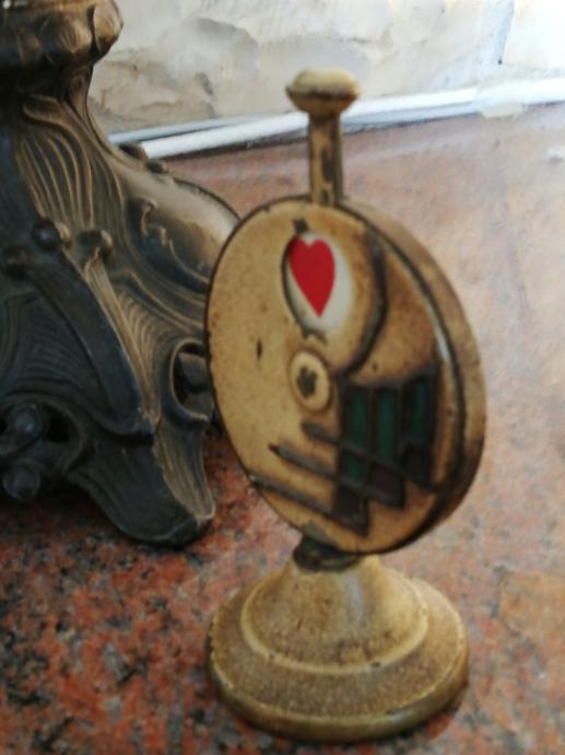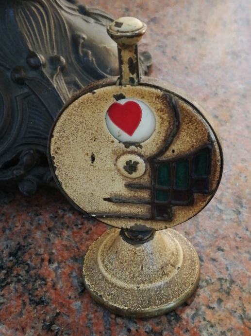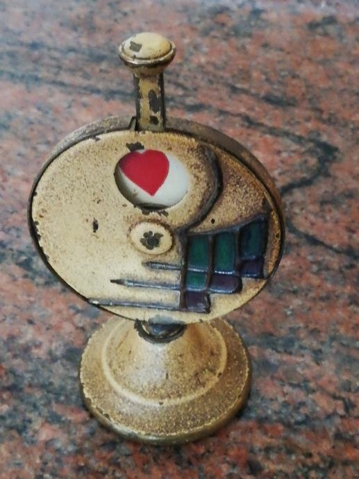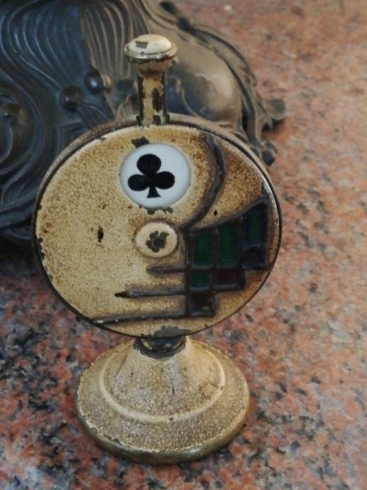 Stari minijaturni mehanički uređaj za igru i zabavu , sa kraja 19 stoljeća, kojima su se gospoda zabavljala u tzv. muškim prostorijama. Materijal: mesing, emajl, porculan. Dimenzije: Visina: 9,5 cm, promjer. 5,5 cm.
