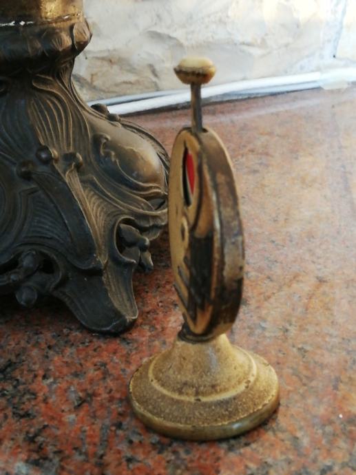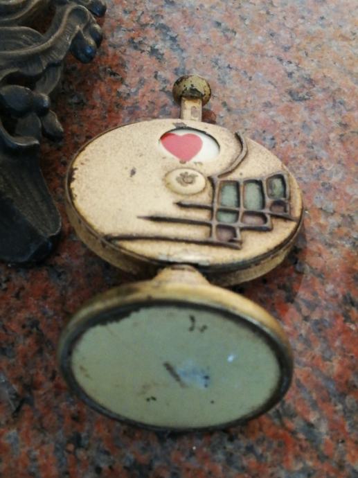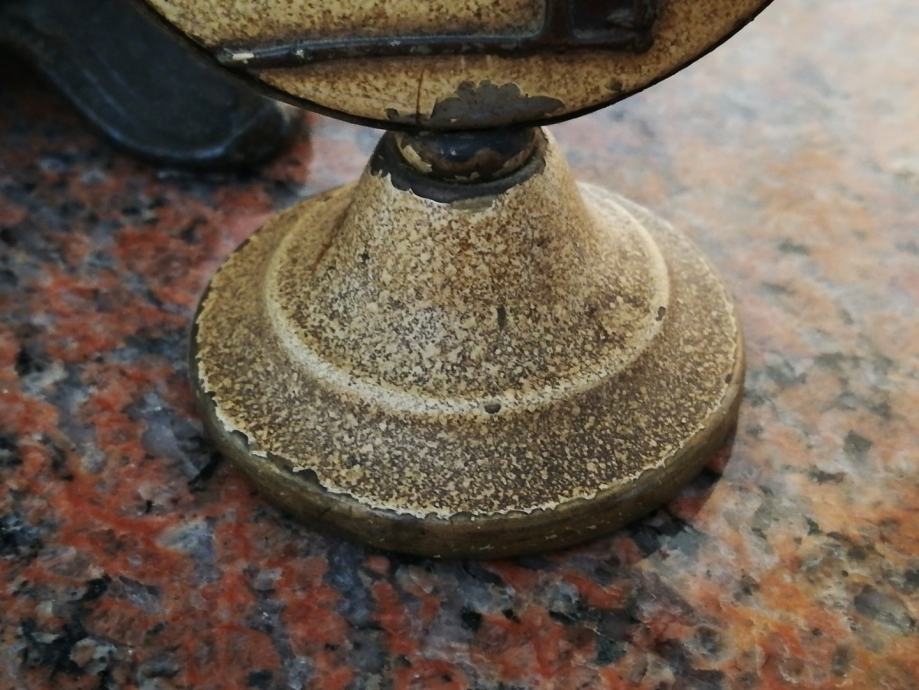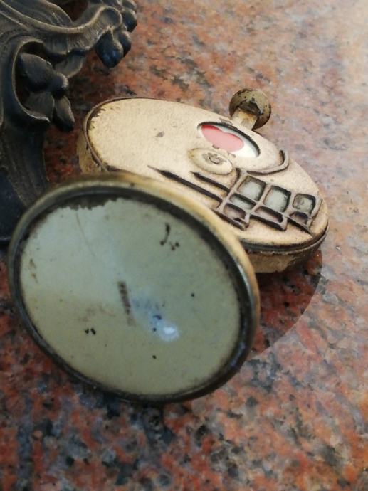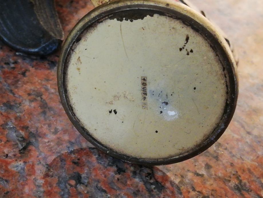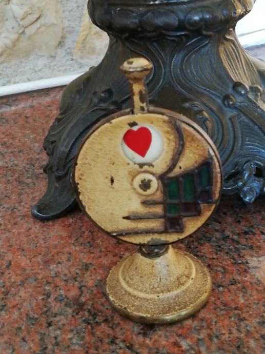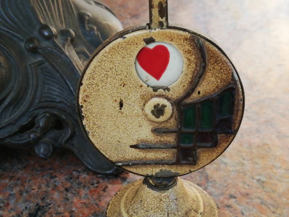 Stari minijaturni mehanički uređaj za igru i zabavu , sa kraja 19 stoljeća, kojima su se gospoda zabavljala u tzv. muškim prostorijama. Materijal: mesing, emajl, porculan. Dimenzije: Visina: 9,5 cm, promjer. 5,5 cm.