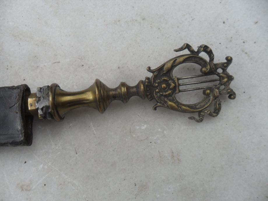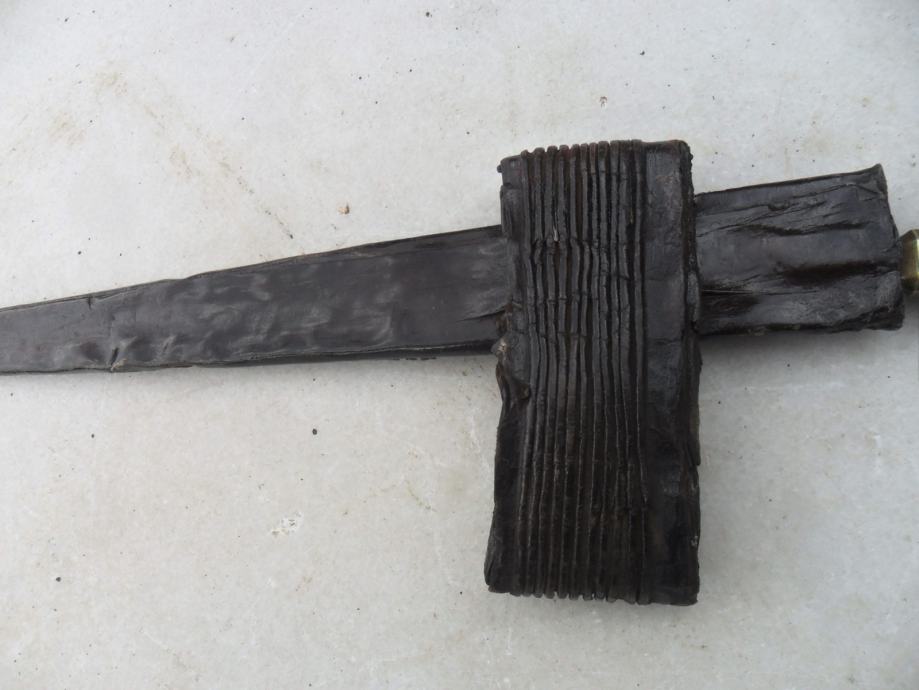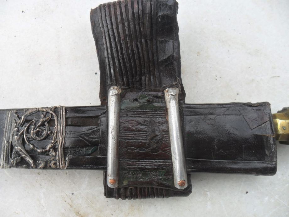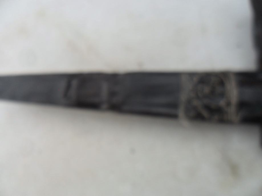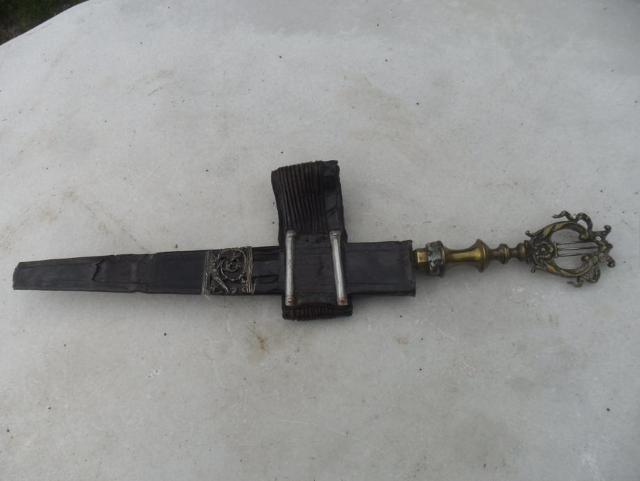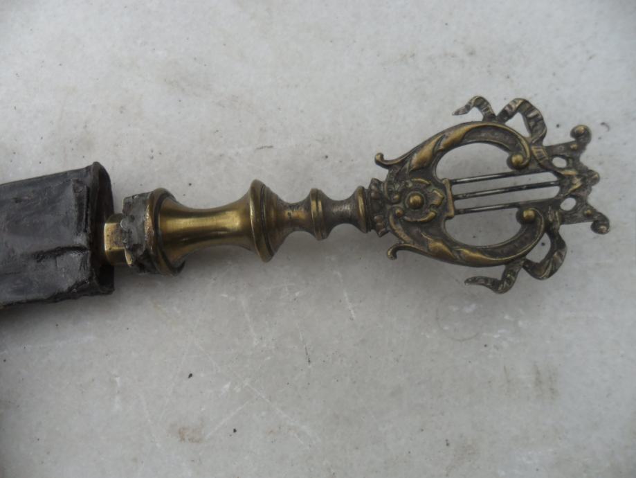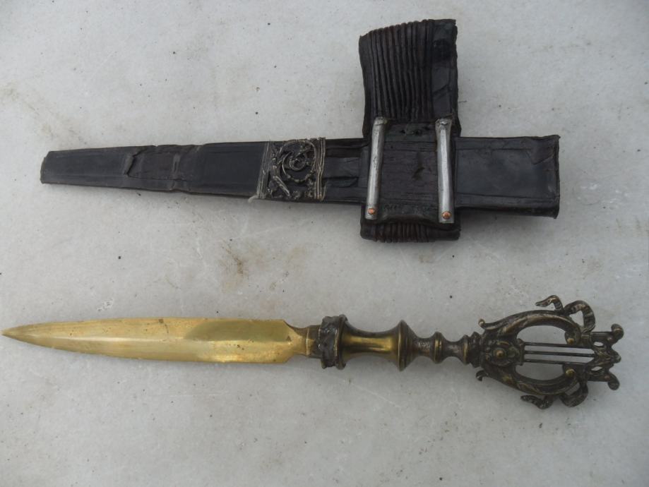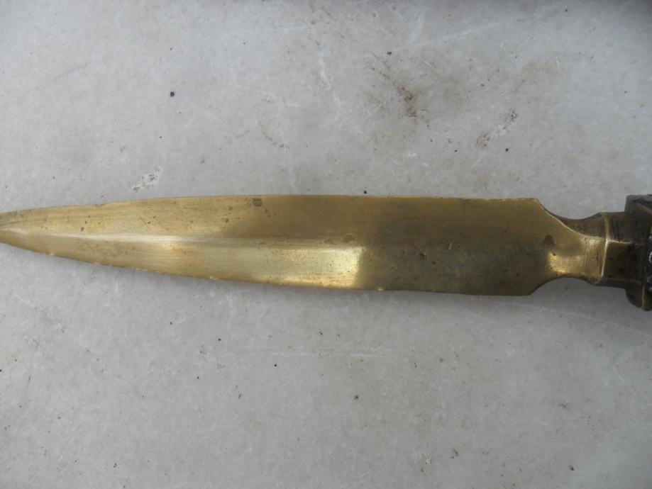 prekrasno,dekorativno i svrsishodno,,tok je od neke vrste kožeukupna dužina sa tokom je 40cm,sami nož 27cm,izrađen u kombinaciji mesinga i neke druge vrste metala