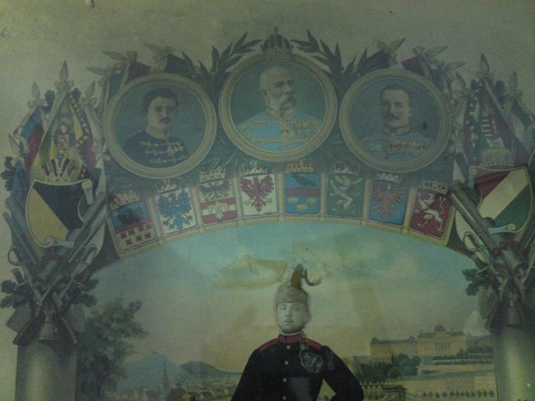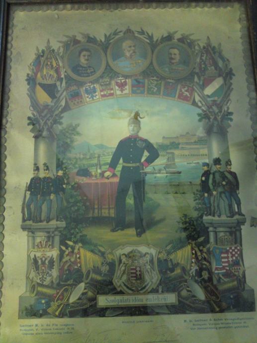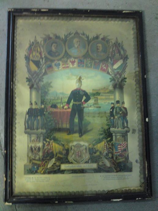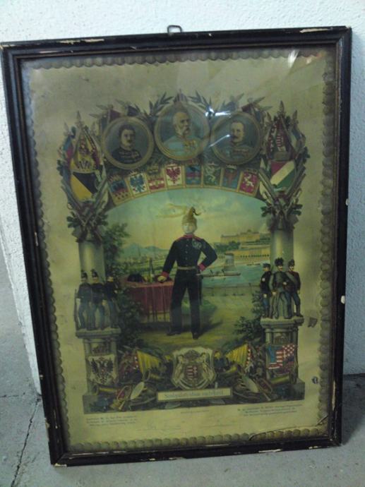 Stari plakat austro-ugarskog cara Franje Josipa, te njegovih generala, sa vojničkim motivima pred I svjetski rat. Plakat uramljen u secesijsku ramu, koju je potrebno restaurirati. Pretpostavljamo, da je plakat tiskan u svrhu jačanja morala stanovništva Austro-ugarske pred 1 svjetski rat. Podrijetlo: Ugarska.
