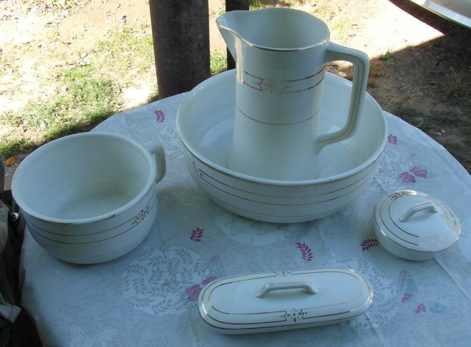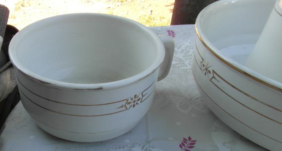 Set je stari korišten i u stanju kao na slikama. Proizveden u Belgiji u Manufakturi Imeriale et Royale. Promjer posude za umivanje je 37 cm , visina vrča 27 cm.