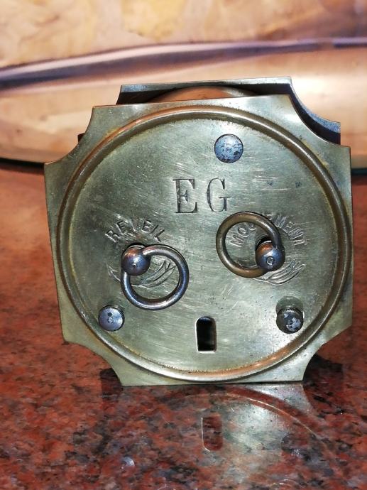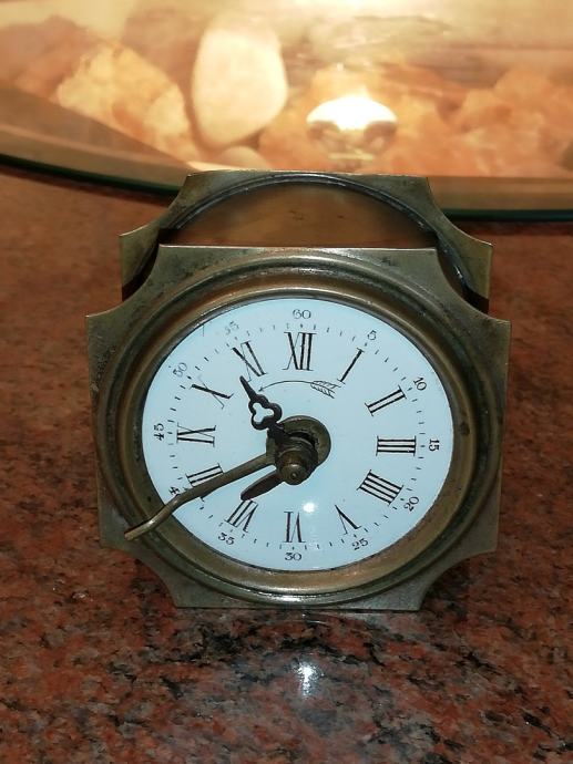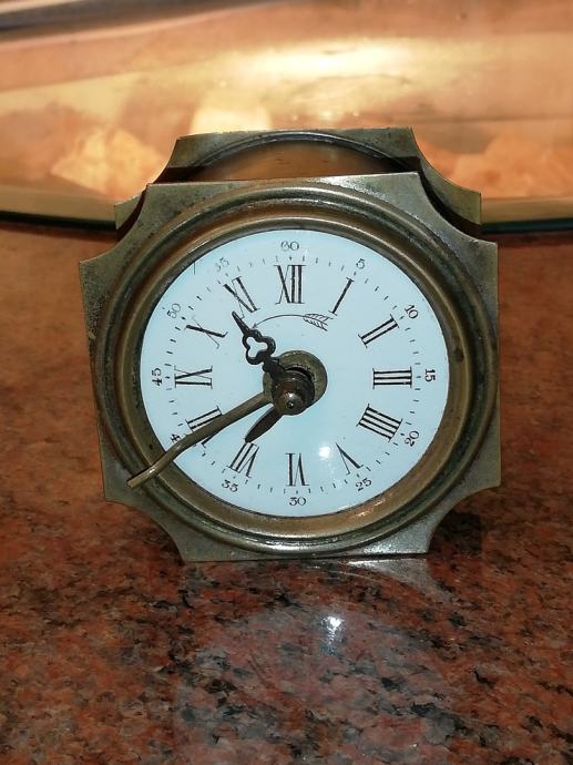 Stari neobični putnički sat, kraj 19 st. - materijal: mesing, porculan, u funkciji, ispravan, obavljen urarski servis, iz privatne kolekcije, dimenzije: 7,0 x 7,0 x 4,5 cm; promjer ziferblatta: 5,5 cm.