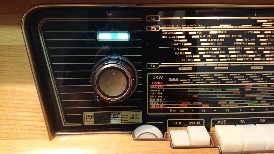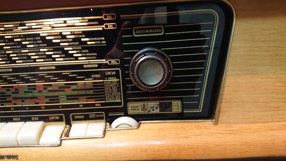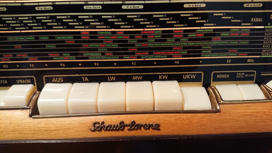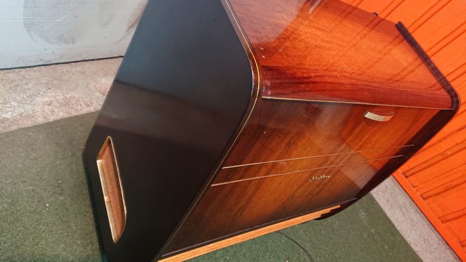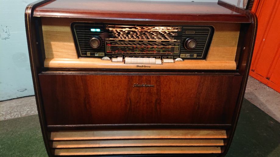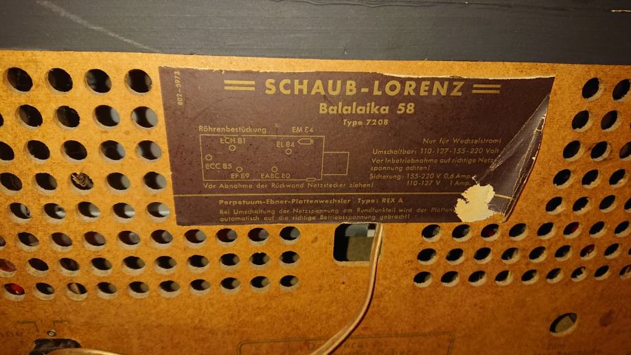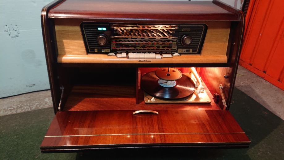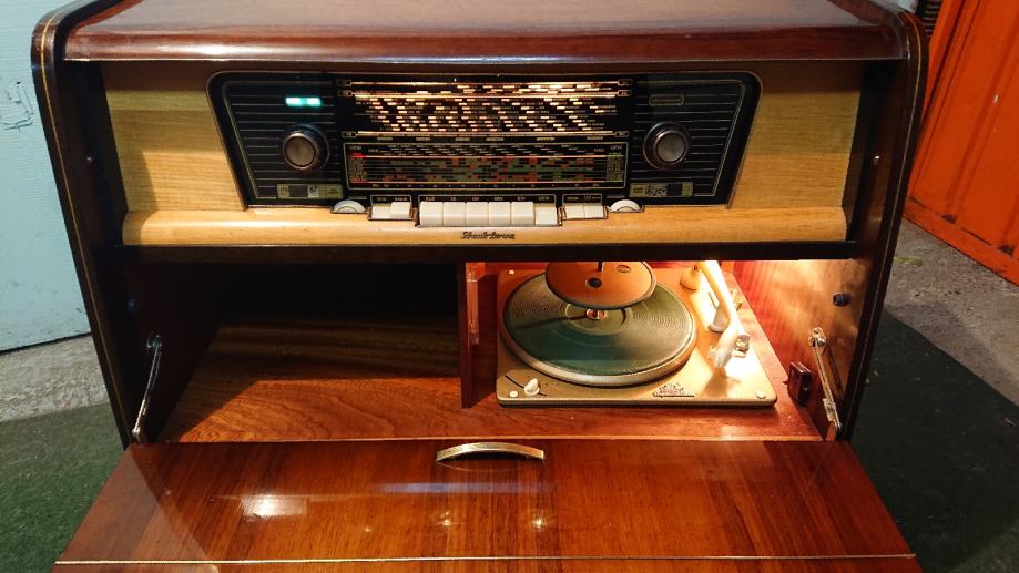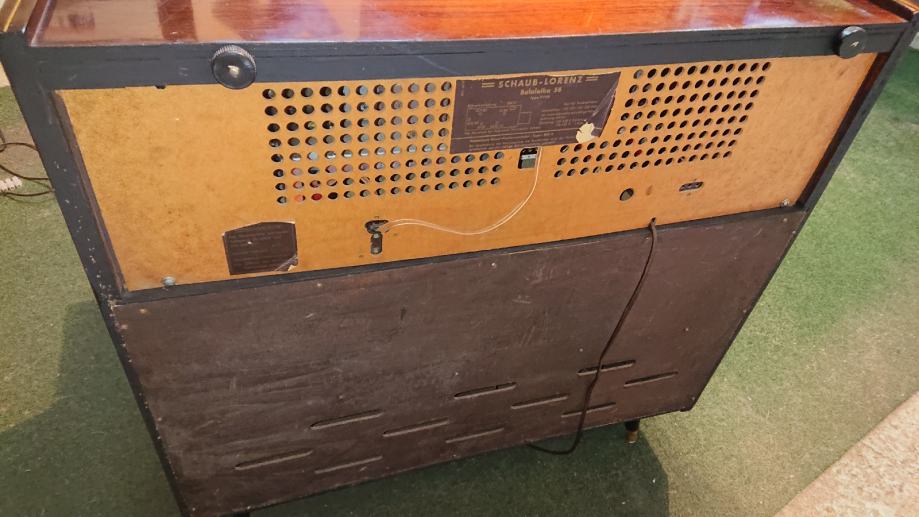Stari radio lampaš SCHAUB LORENZ BALALAIKA 58 s gramofonom PERPETUUM EBNER REX 4, proizveden 1957. godine u Njemačkaoj, sve potpuno ispravno. Radi na svim valnim područjima.