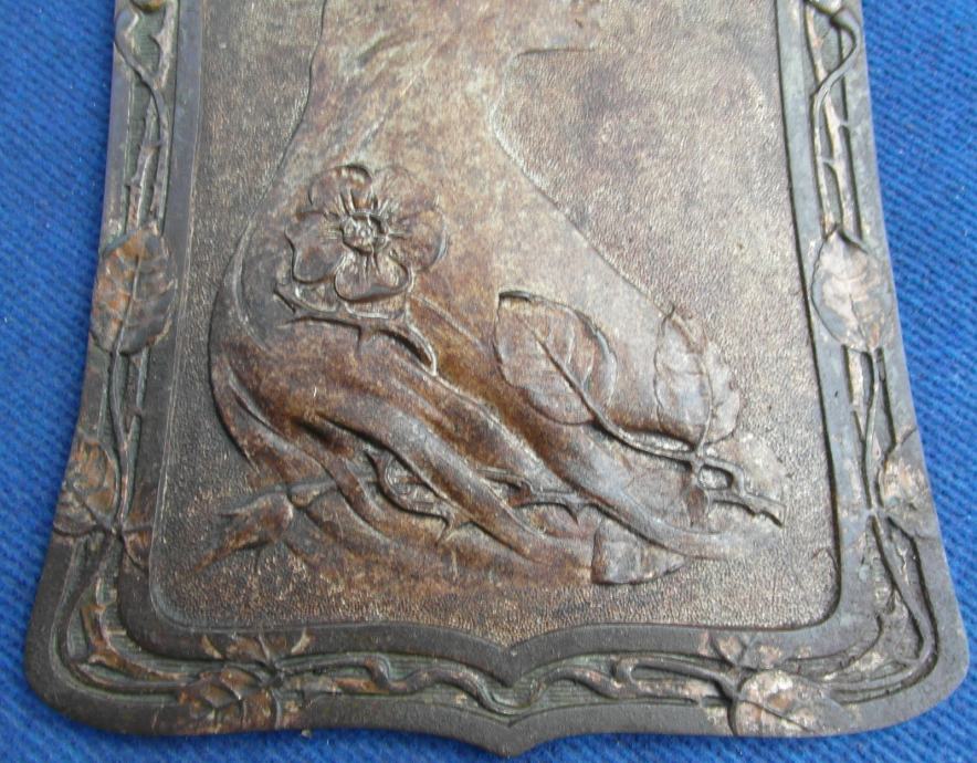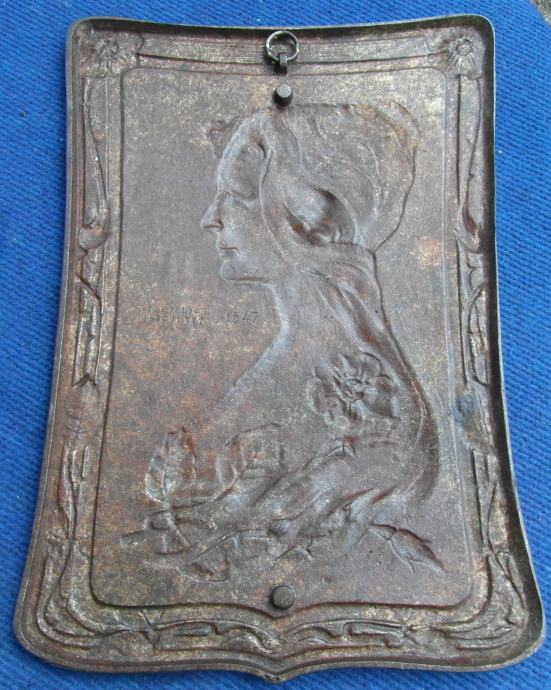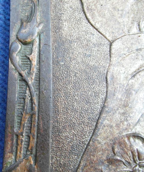 Dimenzije 38 x 26,3 cm. Jako rietko i jako fine izrade. Materijal je gus,a vide se tragovi kao da je slika bila pozlaćena i to s obije strane .Na poleđini je otisnuto GESETZLICH GESCHÜTZT i broj 1547 što bi trebalo značiti da je zaštićeno vlasništvo ili patent.
