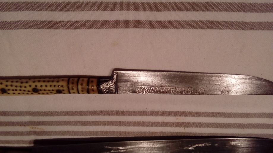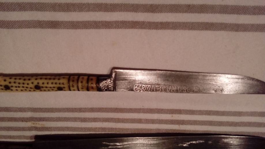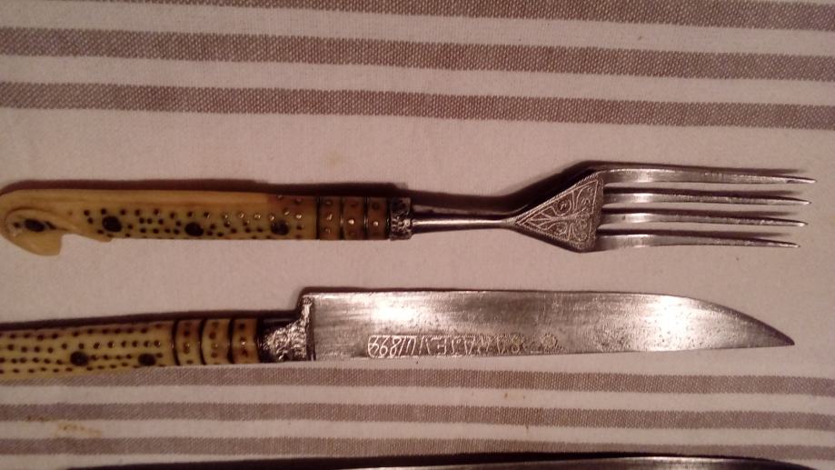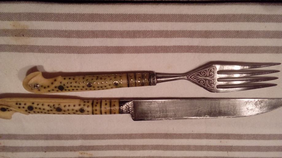 Pribor za jelo sa drškom od bjelokosti punciran srebrnom žicom u odličnom stanju. Može i zamjena za stari stilski namještaj