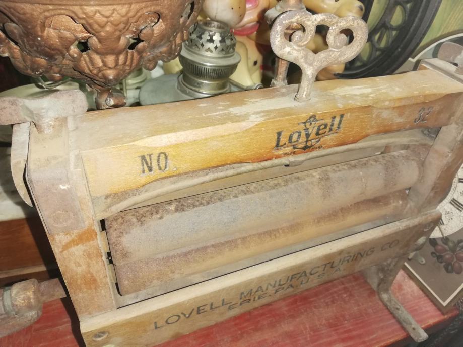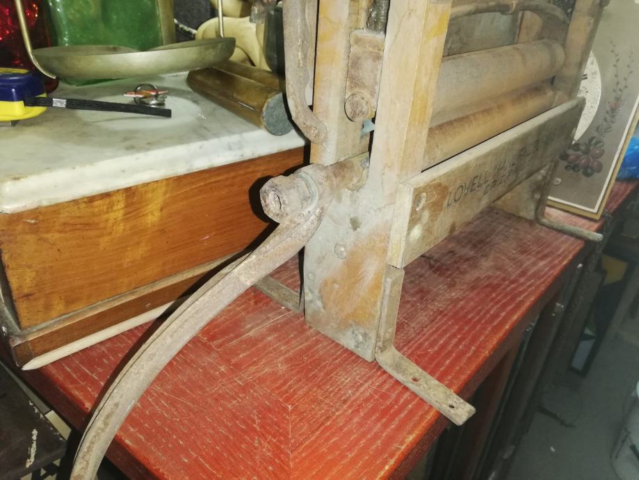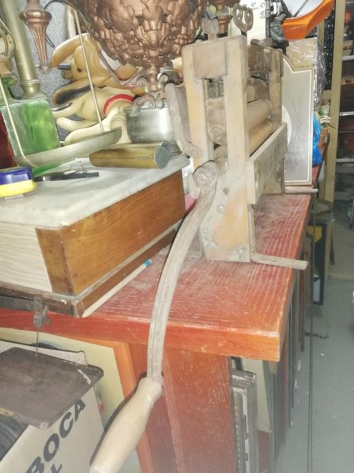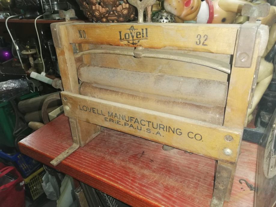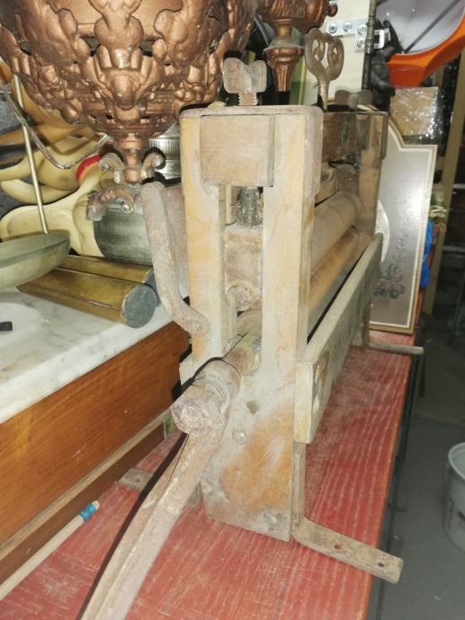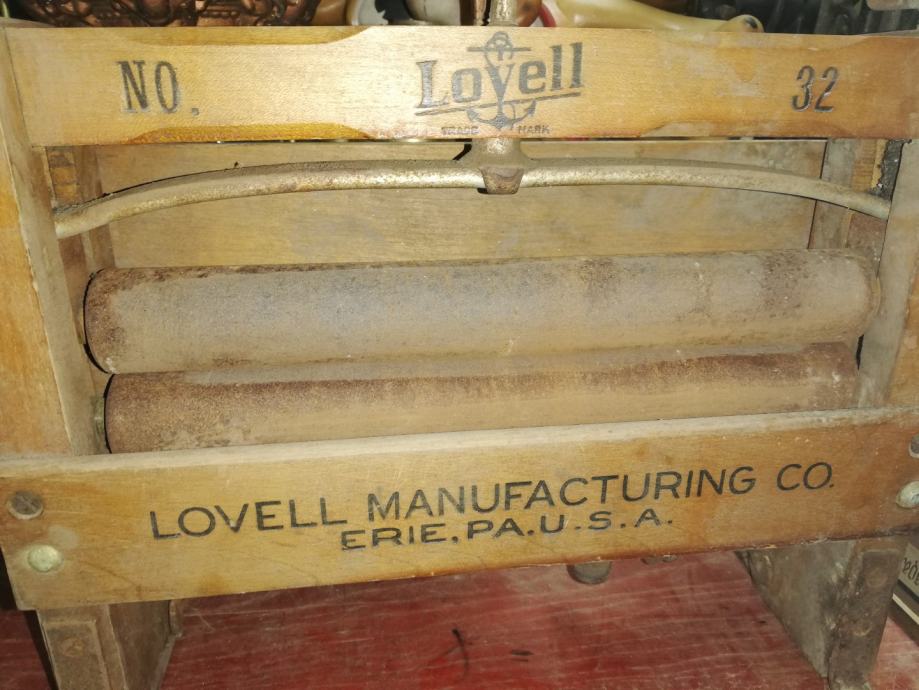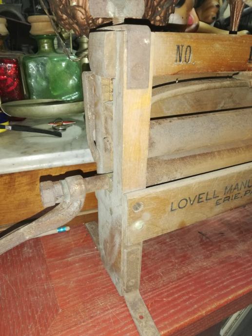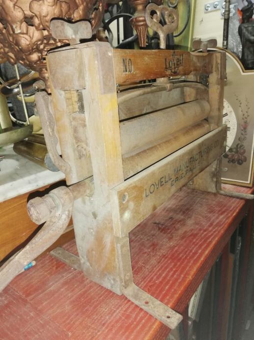 Stari uređaj za cijeđenje veša, materijal: čelik, drvo; sačuvano, iz privatne kolekcije, u funkciji, Lovell manufacturing Co, USA; dimenzije: dužina bez ručke za okretanje: 36,0 cm; ukupna dužina: 66,0 cm; dubina: 22,0 cm; visina. 35,0 cm.