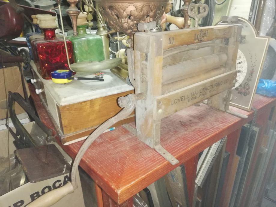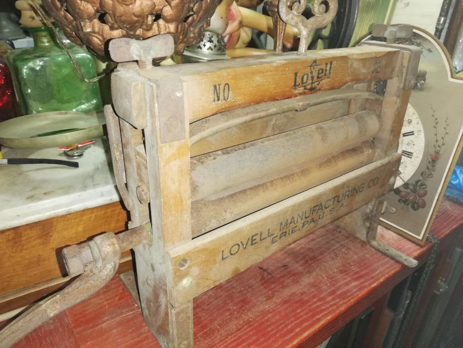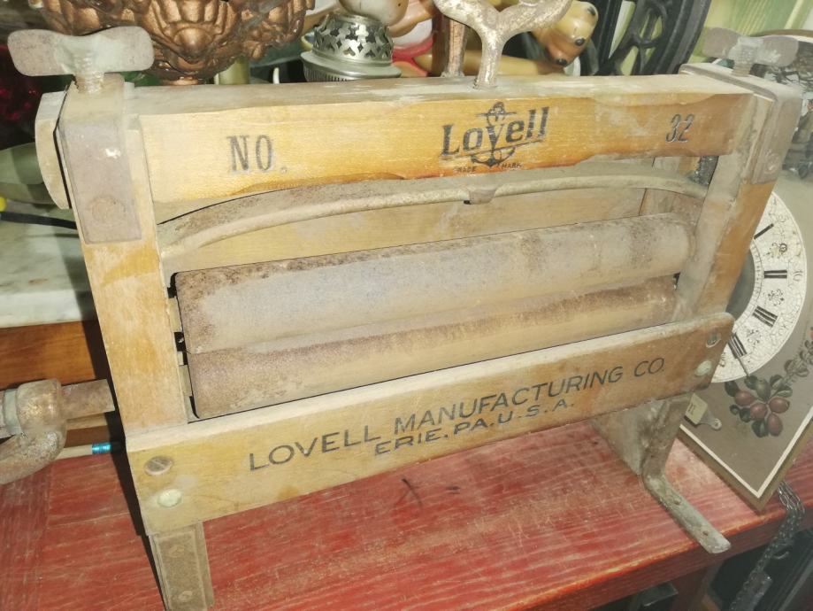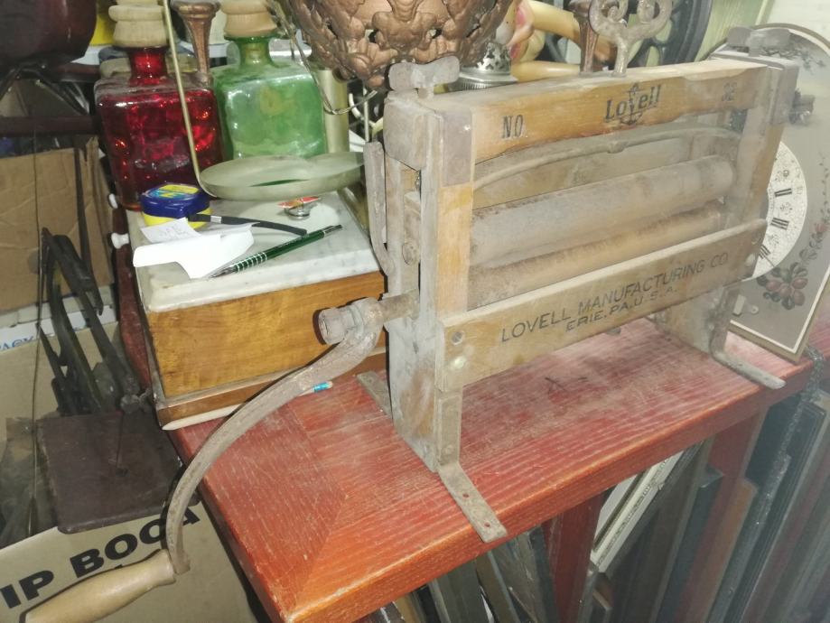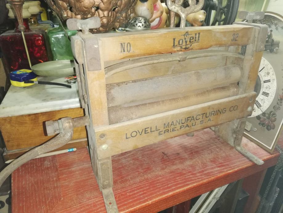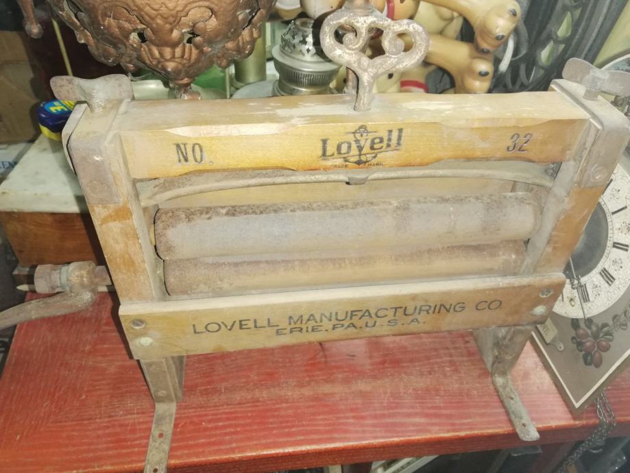Stari uređaj za cijeđenje veša, materijal: čelik, drvo; sačuvano, iz privatne kolekcije, u funkciji, Lovell manufacturing Co, USA; dimenzije: dužina bez ručke za okretanje: 36,0 cm; ukupna dužina: 66,0 cm; dubina: 22,0 cm; visina. 35,0 cm.
