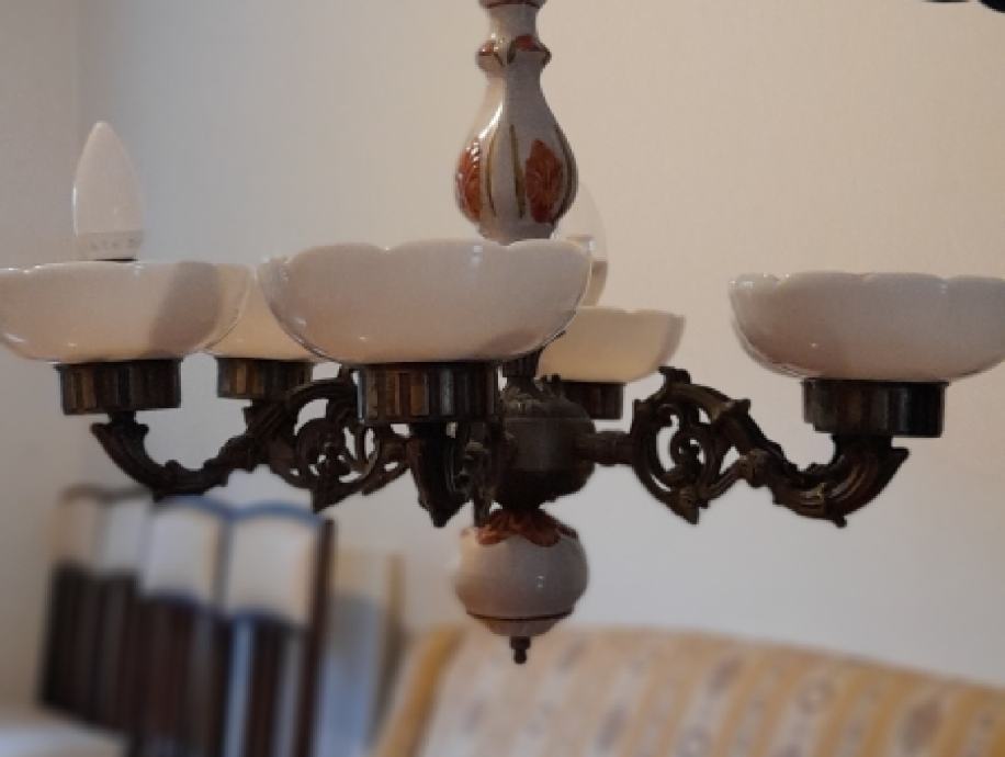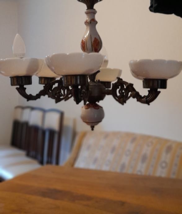 Starina keramički luster sa staklenim sjenilima. Promjer 58 cm, visina 60 cm. U izvrsnom stanju, neoštećen. Instalacije su dobre i moze se odmah koristiti.