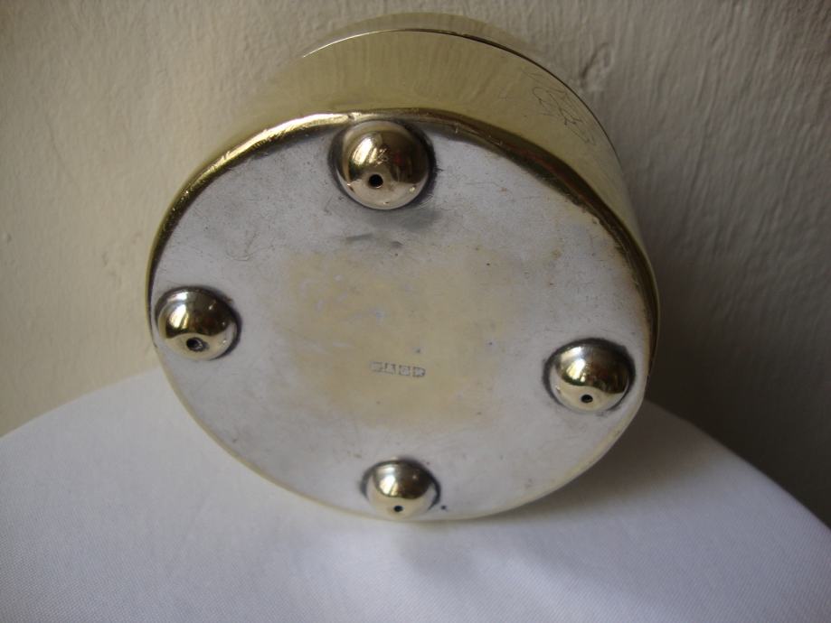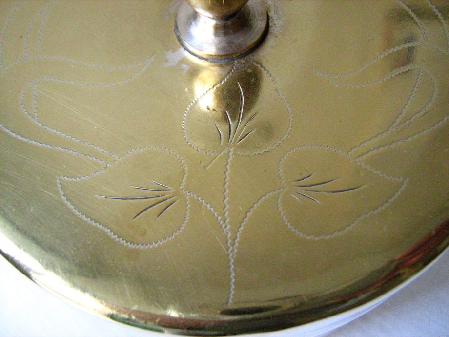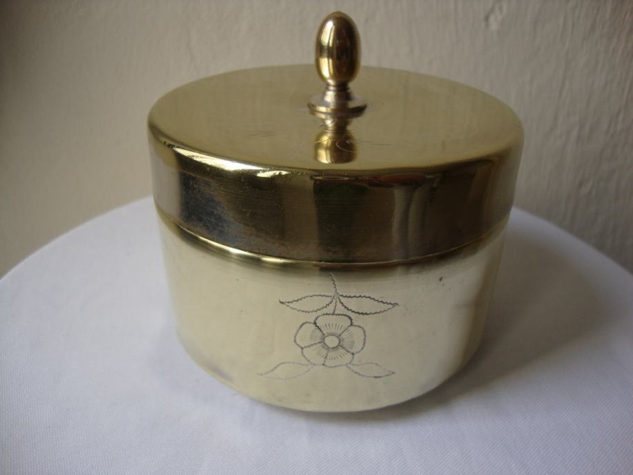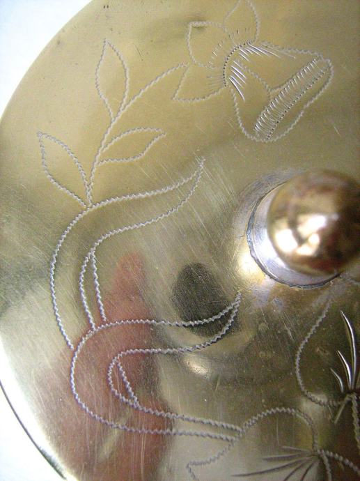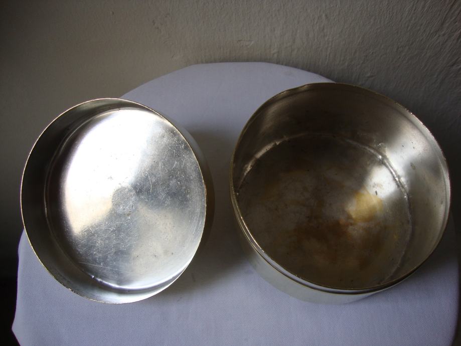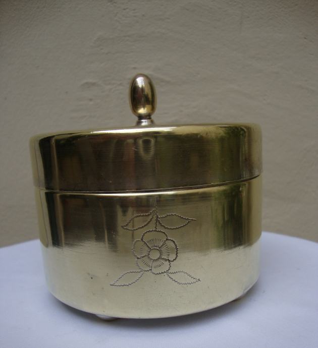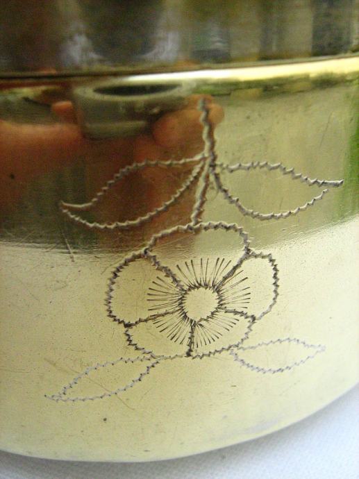 Stara rano njemačka secesijska posrebrena posuda od mesinga sa cvijetnim (graviranim)rezbarenim uzorkom sa strane(bočno) 4 cvijeta,a na poklopcu veliki cvijetovi u odličnom stanju, srebrena povrsina izlizana, iako prisutna unutar posude i na dnu sa vanjske strane,početak 20 stoljeća cca. 1895.godine /1905.god. Dimenzije: visina 7 cm ,promjer 10 cm