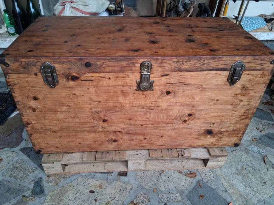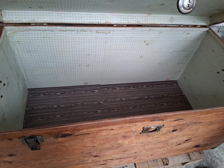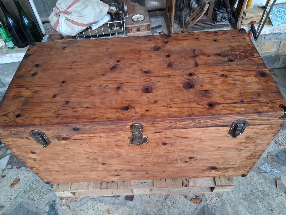 Starinka skrinja duzine 130 cm, dubine 64 i visine 65 cm.