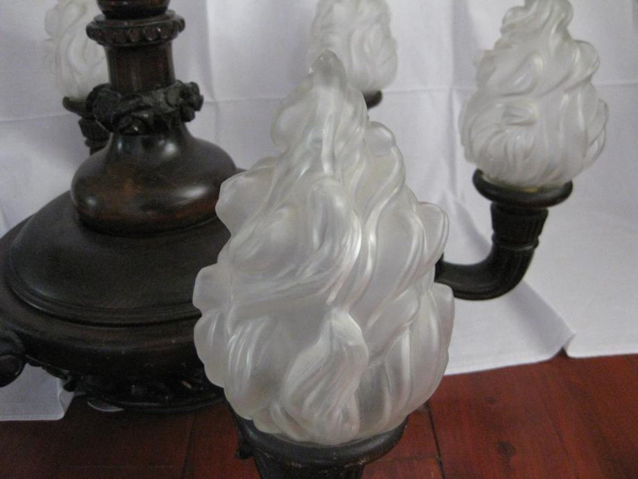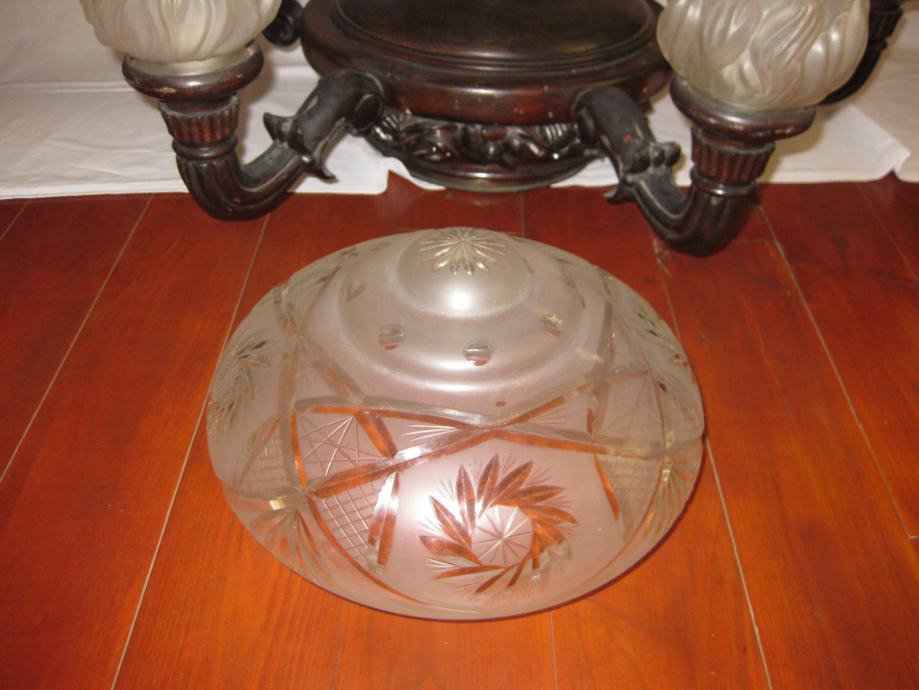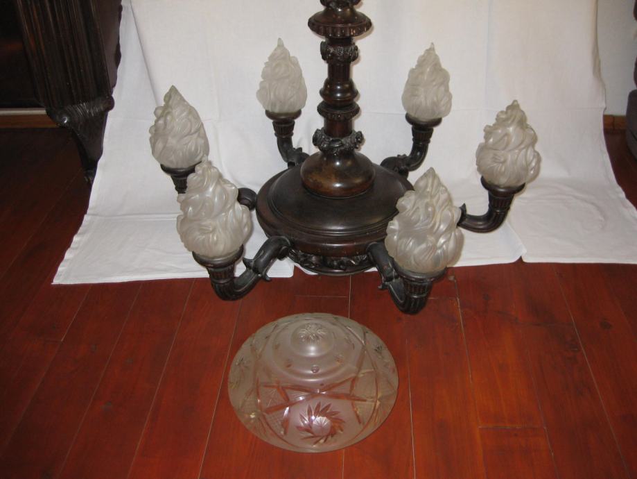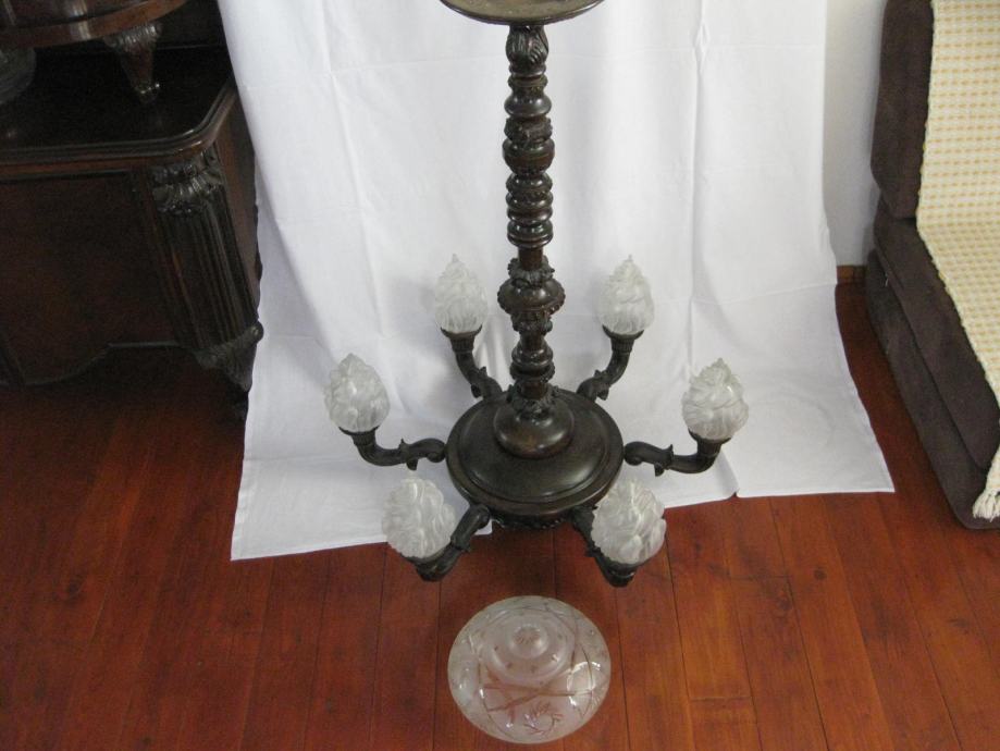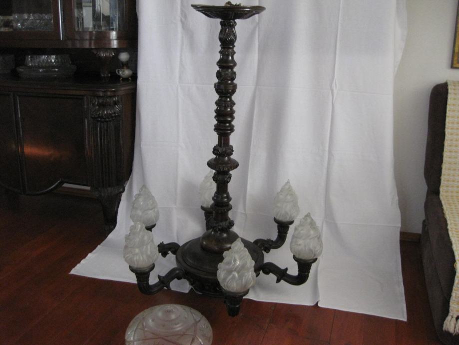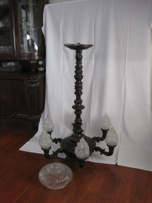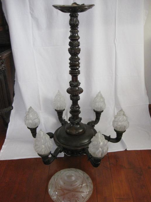 Luster je od drva, ručno rezbaren, sa šest plamenaca od mliječnog stakla i donjom kristalnom polukuglom. Svi dijelovi su originalni i ispravni. Luster je u dosta dobrom stanju bez oštečenja. Struja radi ispravno. Luster je iz Osijeka prebačen u Dubrovnik prije više od 60 godina. Dostavu plaća kupac.