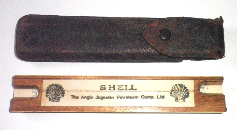 Drveno logaritamsko računalo iz doba Kraljevine Jugoslavije sa logom Shell-a.,