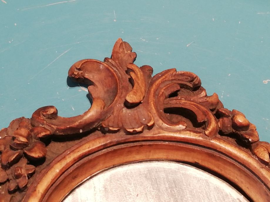 Staro ručno drveno ogledalo, iz doba baroka, umjetnički rad, drvo u odličnom stanju, nedostaje zrcalo, iz privatne kolekcije, raritetno. Dimenzije: dužina: 37,5 cm, širina: 14,0 cm.