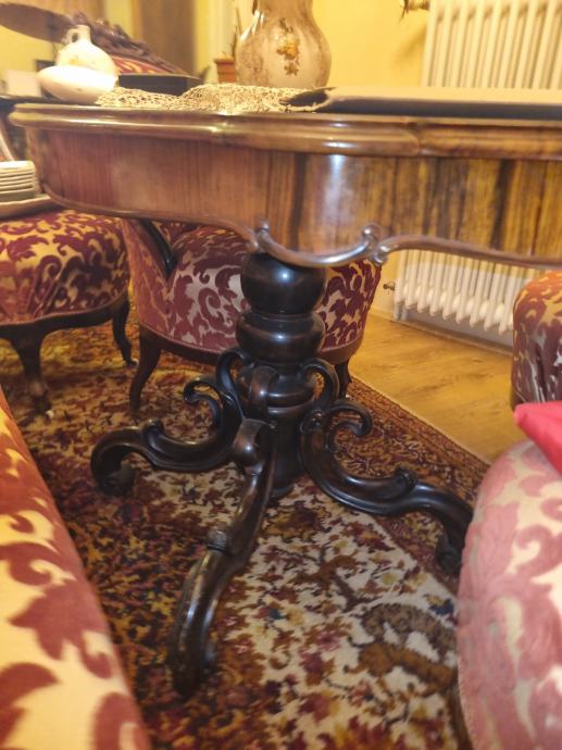 Centralna noga bogato profilirana, s lijepim volutnim završecima. Furnir lijepog crteža, prirodna patina.