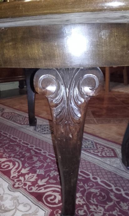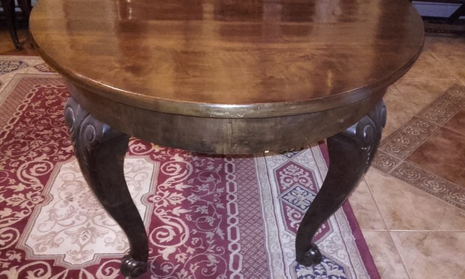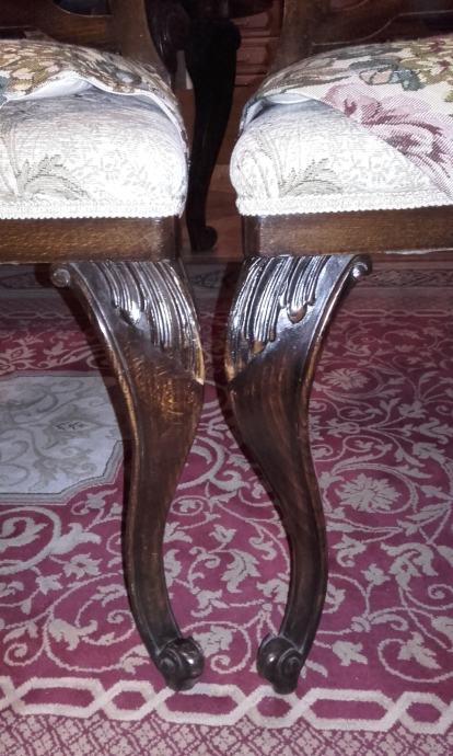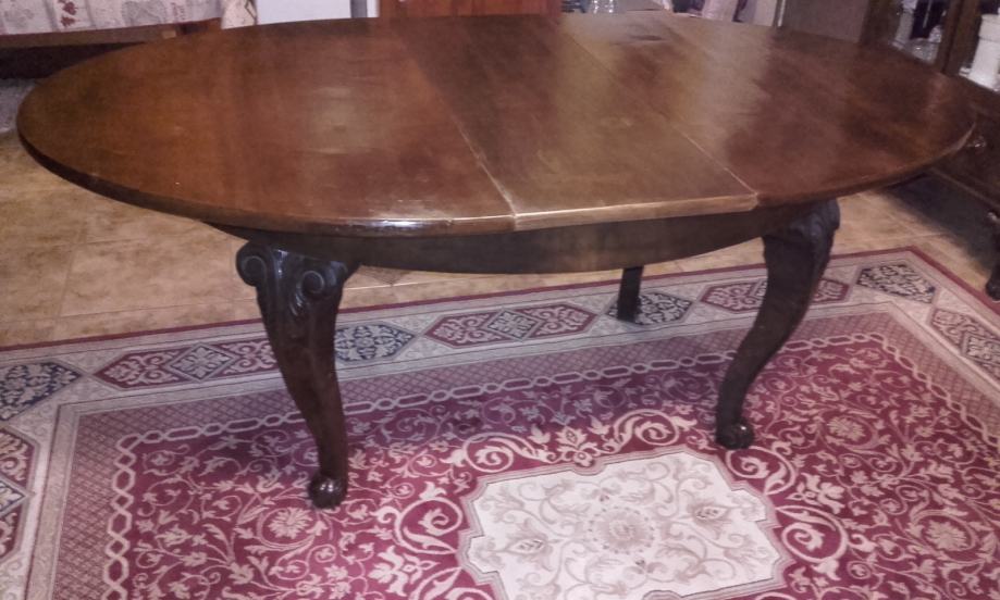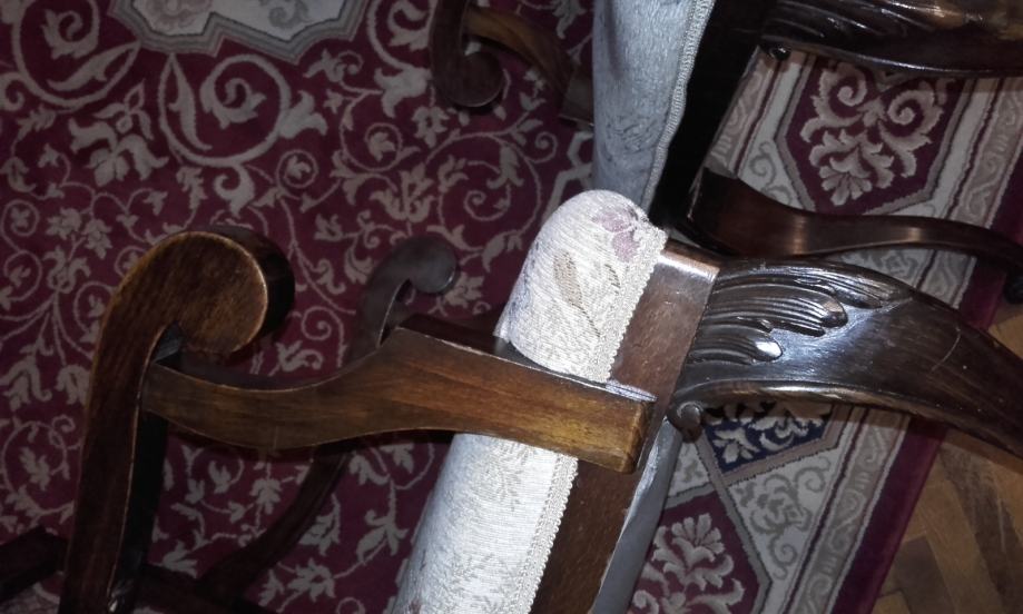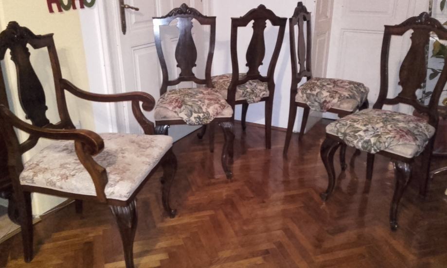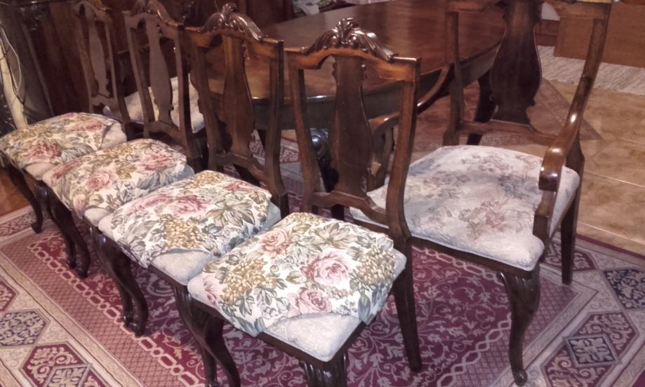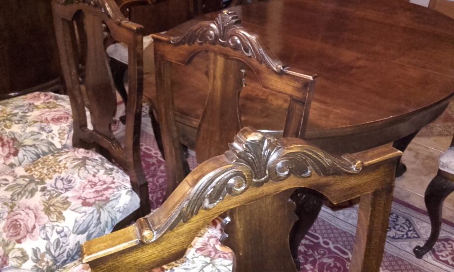 Prodajem očuvani (i korišteni do danas) stilski set izrađen oko 1910-1920 god. Stol na razvlačanje s dvije muške (s rukonaslonom) i 6 ženskih stolica. Stol se može razvući s 150 na 190 cm duljine, ima širinu 113 cm i visinu 76,6cm. Furnir je orah a noge su od punog drveta, debljine ploče 3cm i sarga 11cm. Stolice s rukonaslonom imaju visinu 109cm, visinu sjedišta 50cm, dimenzije sjedišta 50x50cm. Stolice bez rukonaslona imaju visinu 109cm, visinu sjedišta 51cm, dimenzije sjedišta 44x48cm. Vrlo ugodne i komotne stolice s očuvanim originalnim tapecirungom iz vremena; sjedište na opruge, bez oštećenja. Stanje vrlo, vrlo dobro do izvrsno.