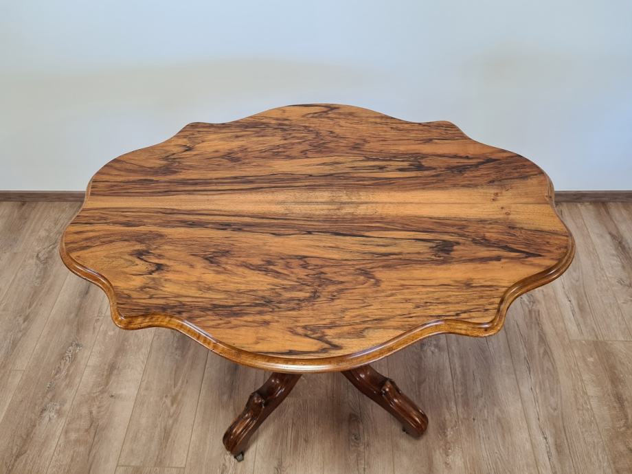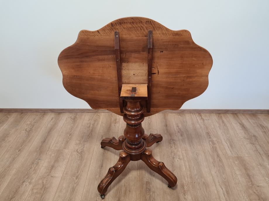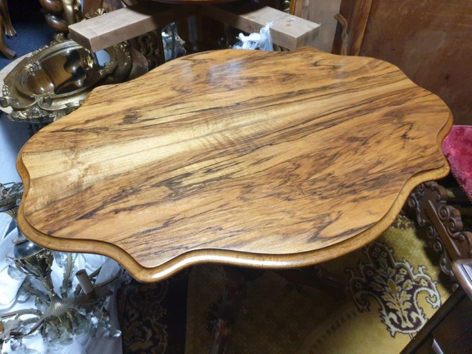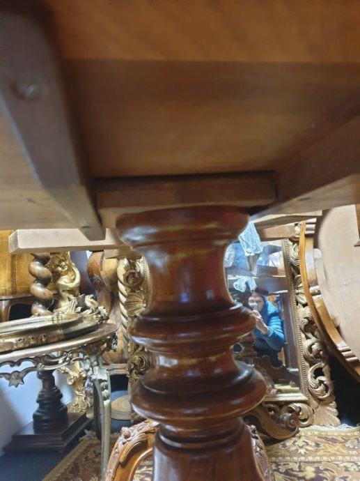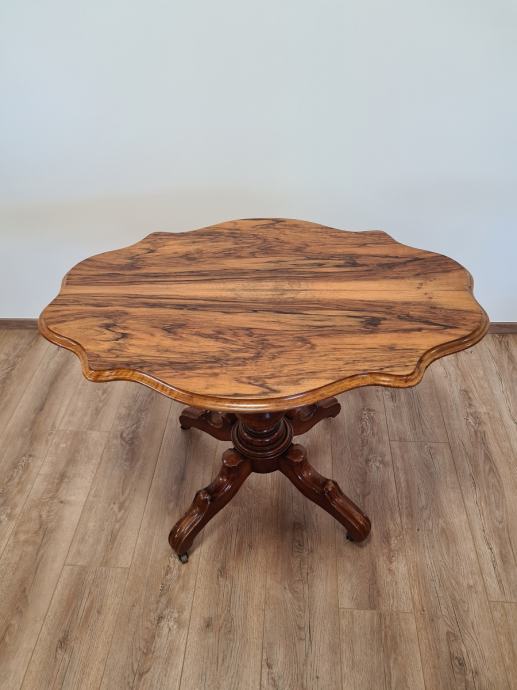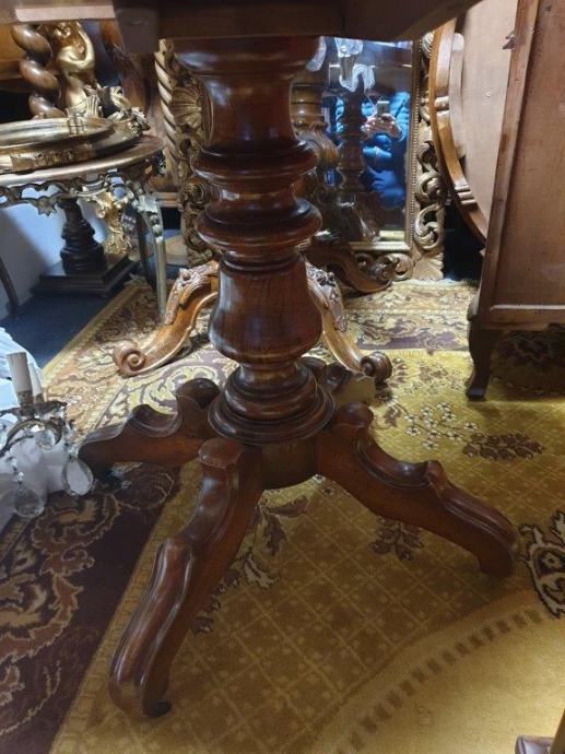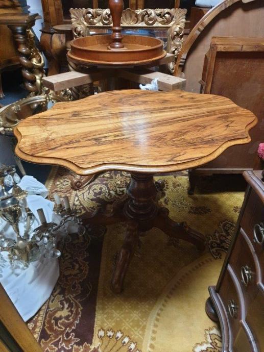 Stol manjih dimenzija, postolje od trešnje, radna ploha od korijena oraha. Vrhunski komad, rijetko.