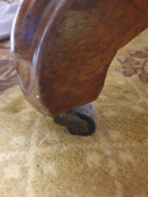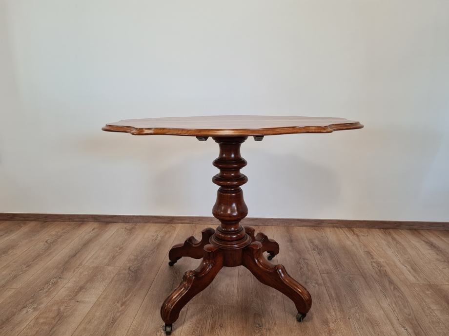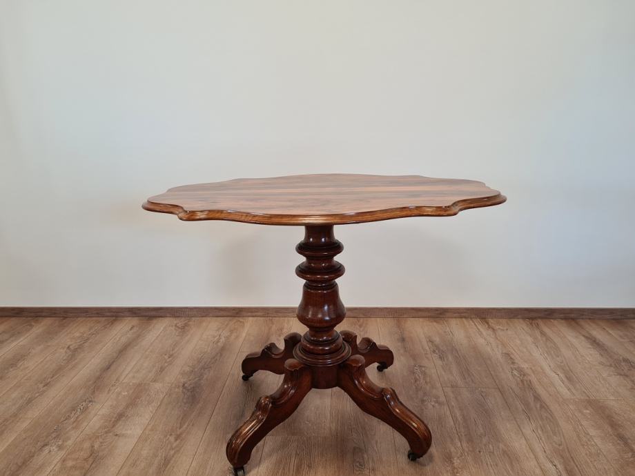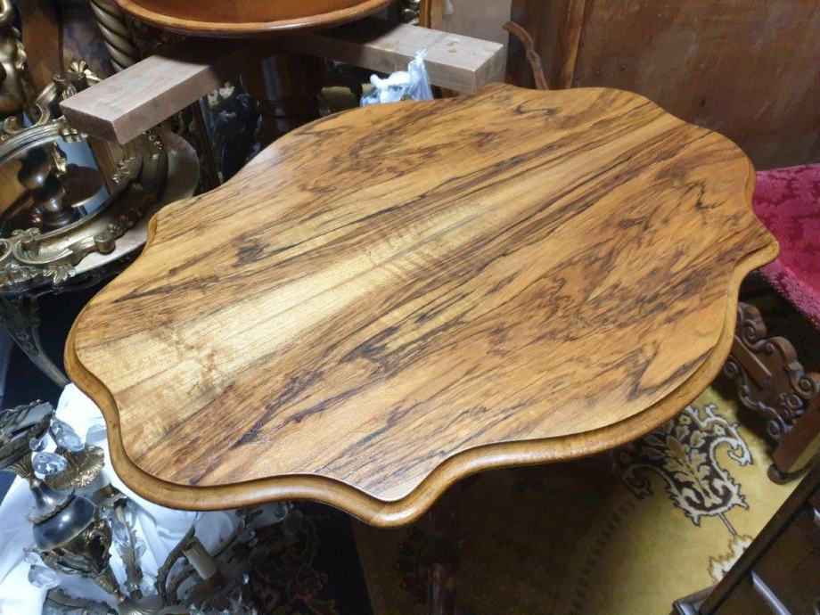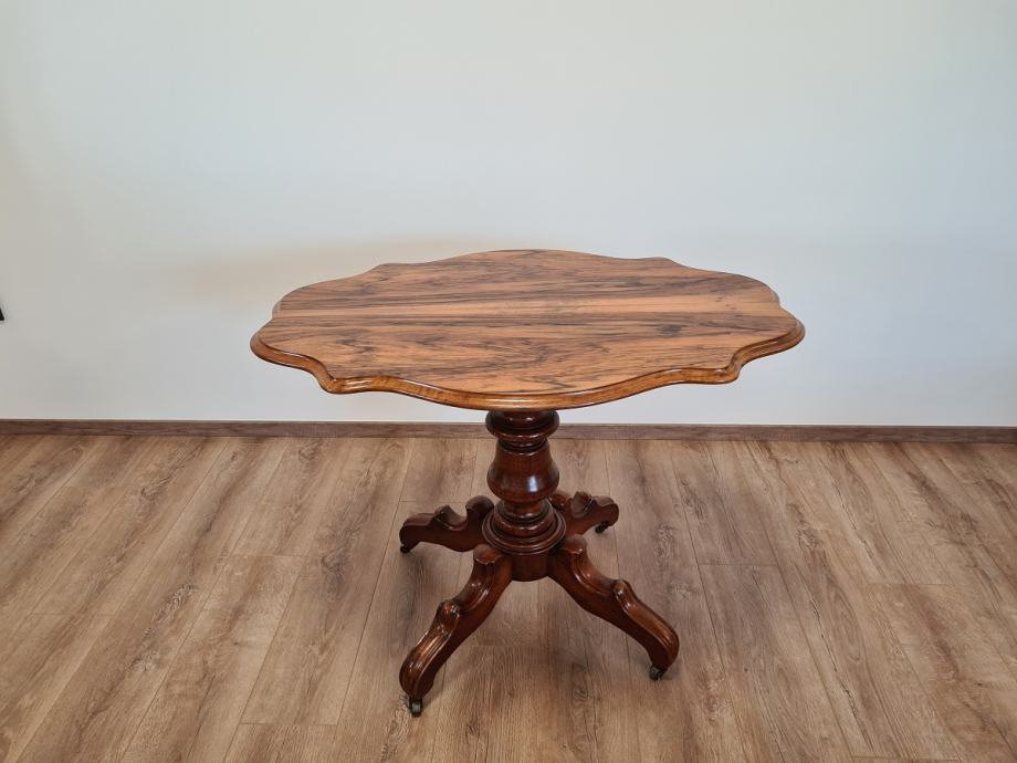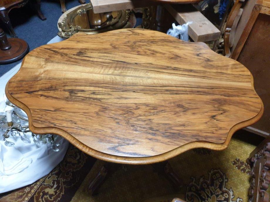 Stol manjih dimenzija, postolje od trešnje, radna ploha od korijena oraha. Vrhunski komad, rijetko.