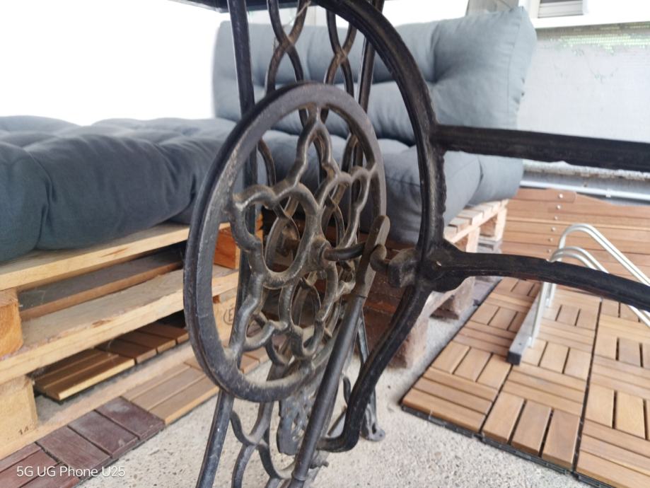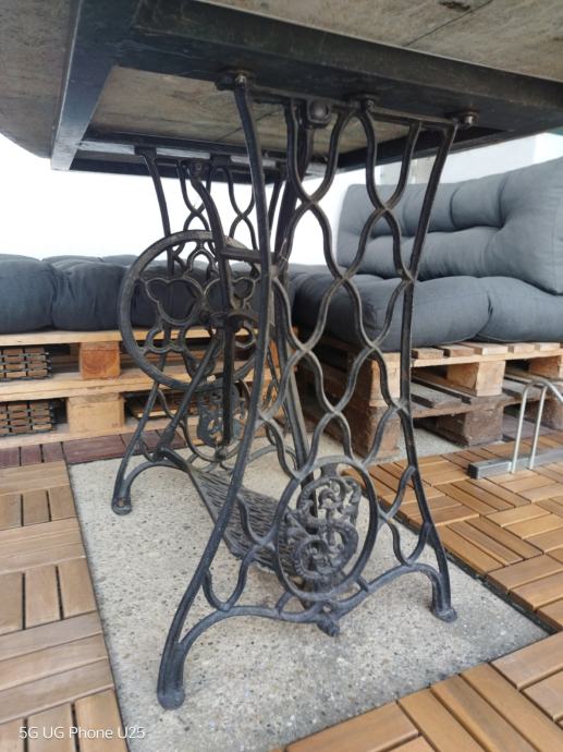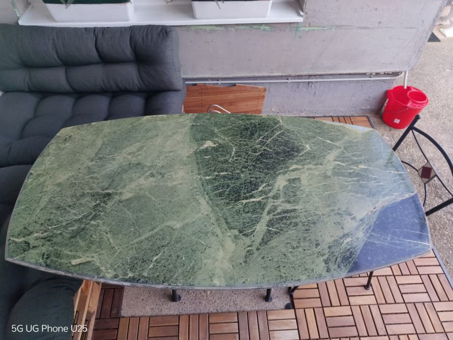 Stol s pločom od zelenog mermera i postoljem od lijevanog željeza (originalno postolje šivaće mašine – vrlo čvrsto i dekorativno).
