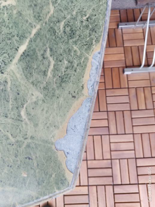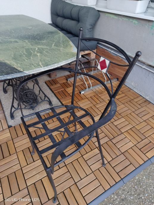Stol je težak i stabilan. Na ploči od mermera ima vidljivih oštećenja (okrhnuti rubovi, sitne pukotine – vidi slike), ali je potpuno funkcionalan. Stolice su čvrste i masivne, trebaju samo jastuke/sjedišta po želji.