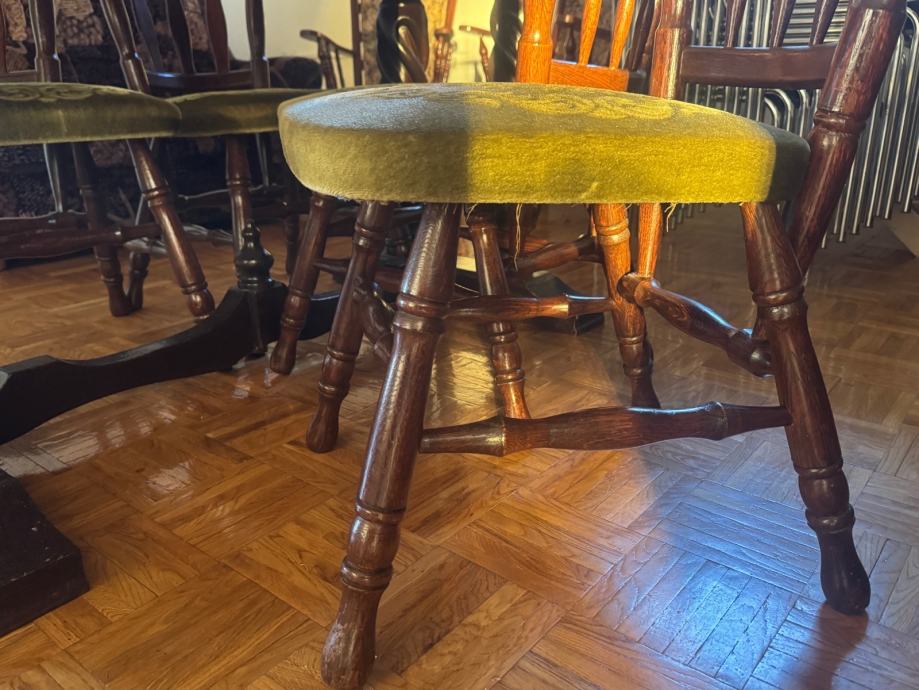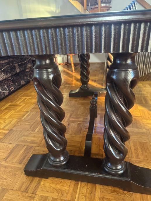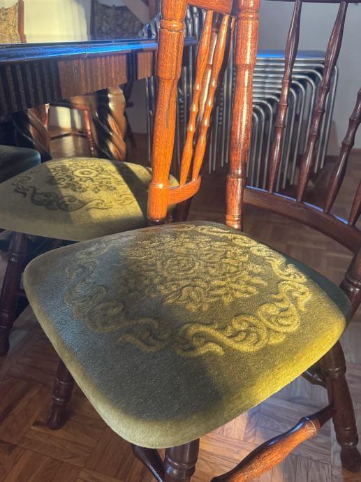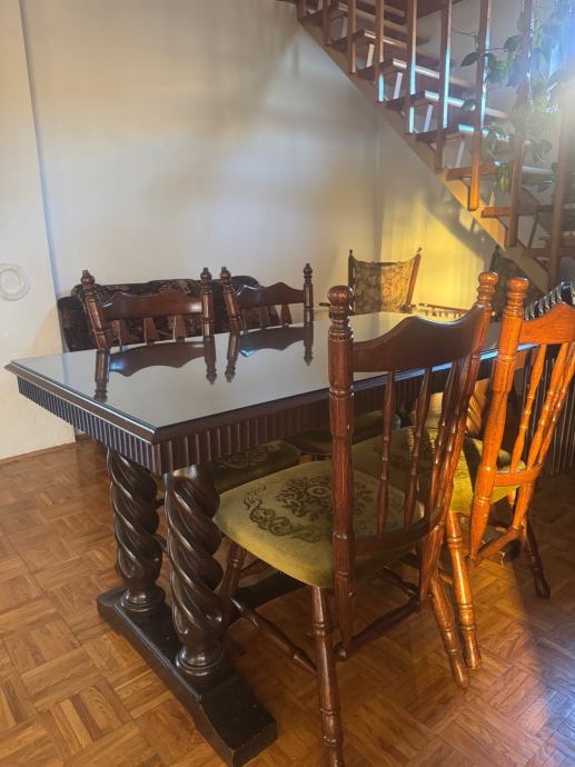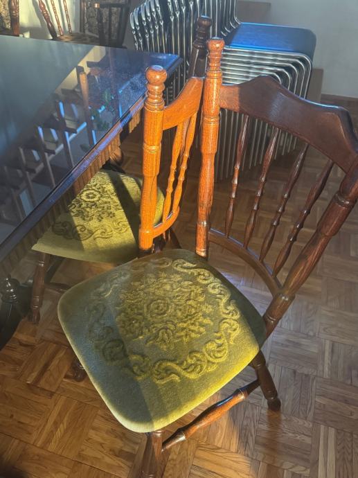 Stol na razvlačenje sa staklenim pokrovom koji se može maknuti. Četiri drvene stolice (dva različita ali slična seta sa istim tapecirungom. Jako dobro očuvano. Stol je rastavljen a nazad se sastavlja u nekoliko minuta. Moguća dostava na sjeveru Hrvatske uz nadoplatu.