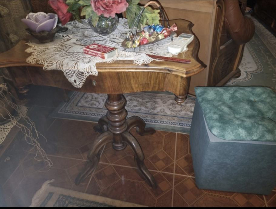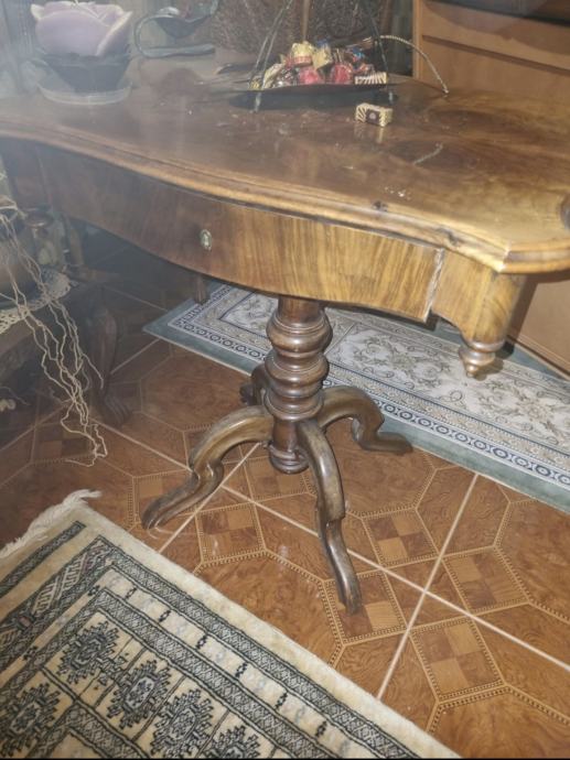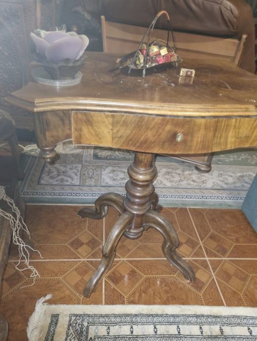 Starinski stolić s jednom ladicom, izrađen od punog drveta s lijepim furnirom.