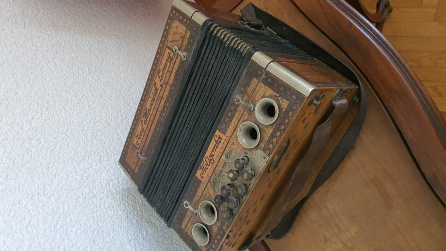 Uz stolić za poklon harmonika Heligonka, izrađena oko 1900.-te godine u radionici Josefa Hlavačeka, u Češkoj.