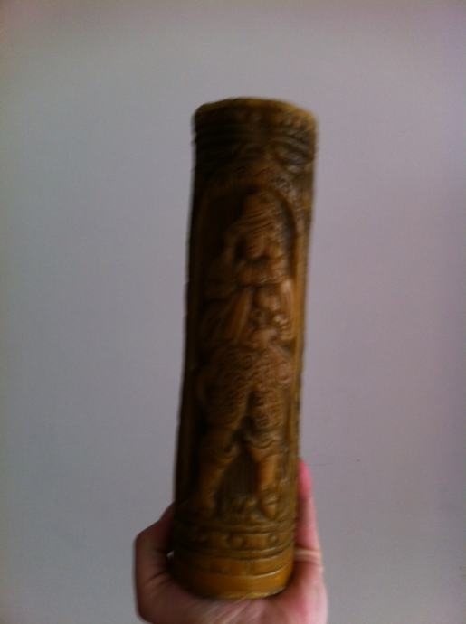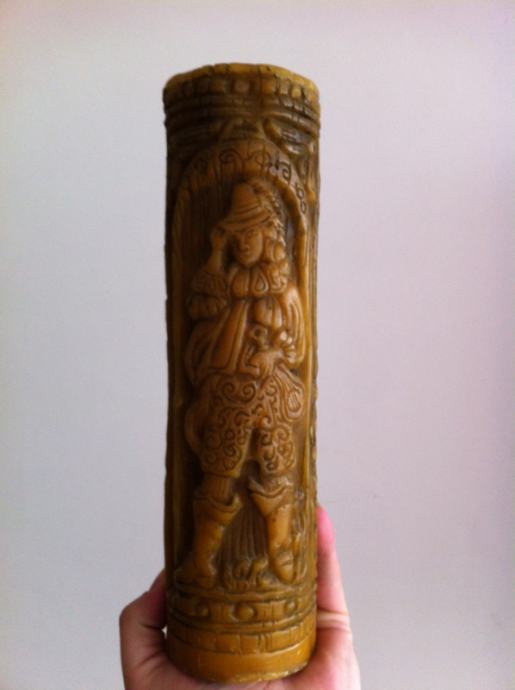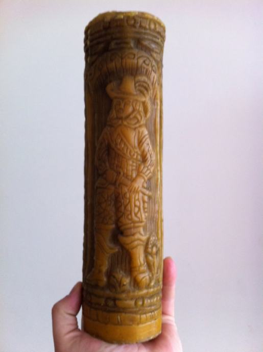 svijeca je napravljena na jedan od narijedjih nacina pravljena svijeca,vosak motan u krug grijanjem a potom su rezbareni likovi koji se nalaze na svijeci...