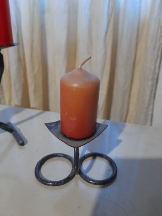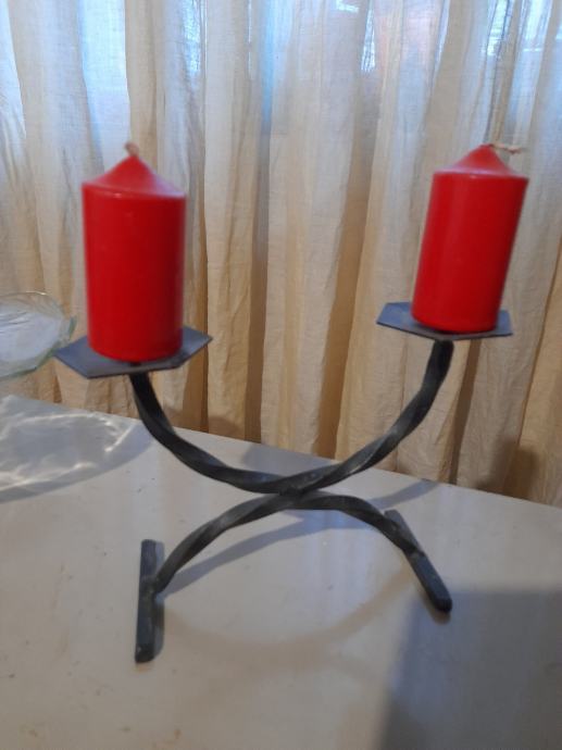 Majstorski rad od kovanog željeza.Lijepa dekoracija za stol.Daje intimnu atmosfer svakom druzenju.Ne saljem.Cijena je za 2 svijecnjaka,veći manji sa svijecama.