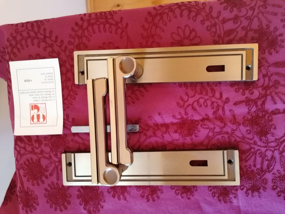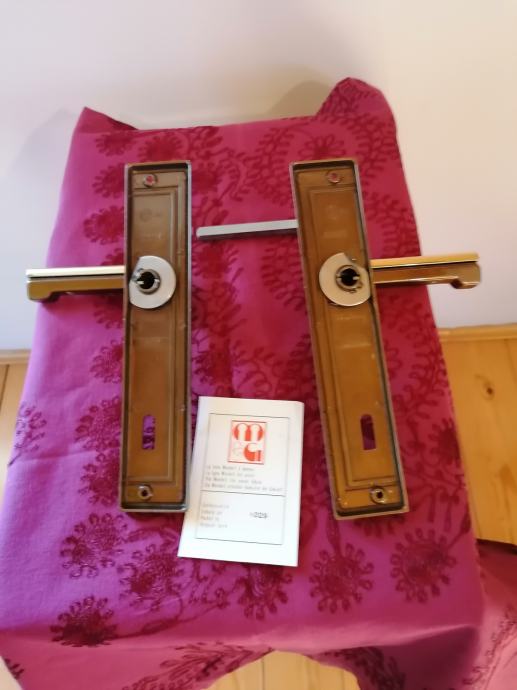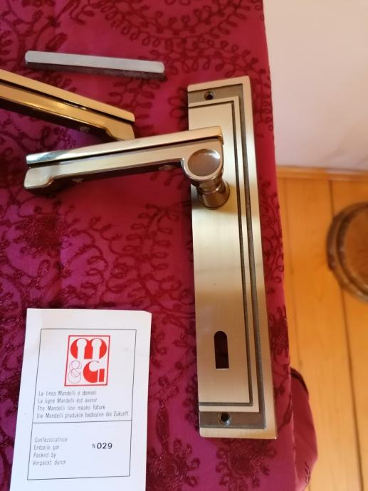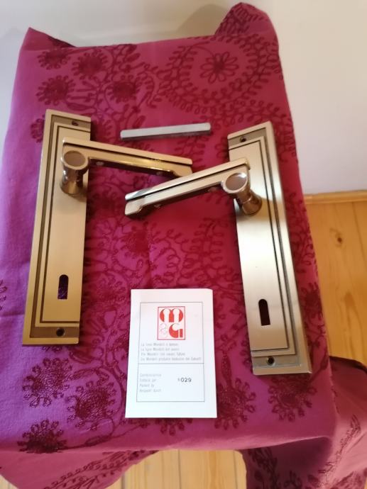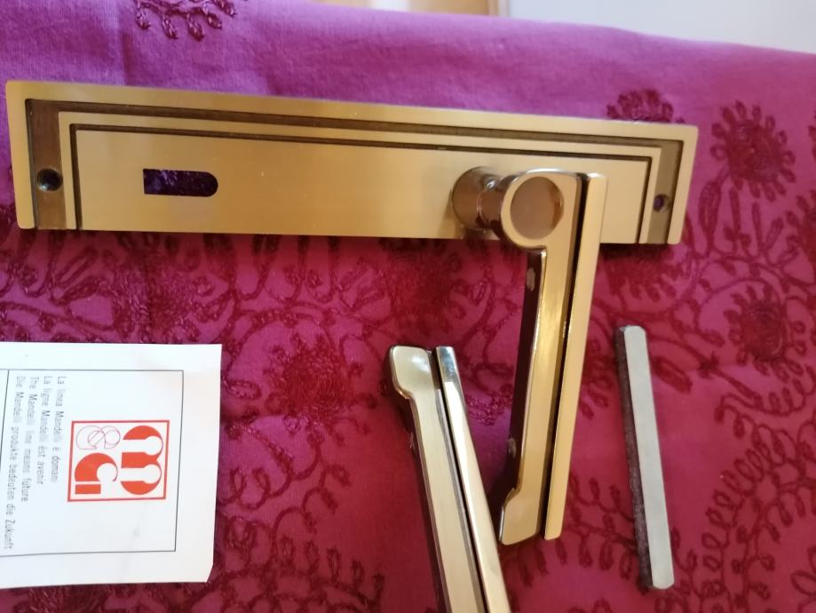 Predivan komplet talijanskih kvaka sa rozetama i uloškom. Art deco stil. Nekorišteno, još u originalnoj kutiji. Masivni mesing. Visina 22,5 cm. Dobijete predmet sa slika.