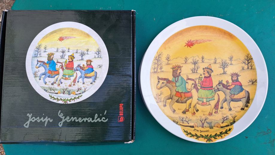 Prodaje se porculanski tanjur, nekorišten, u kartonskoj kutiji, s motivom "TRI KRALJA" naslikanim od strane Josipa Generalića. Tanjur je promjera 25 cm i na poleđini ima omču za vješanje.