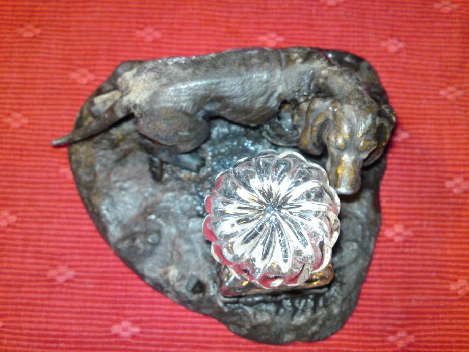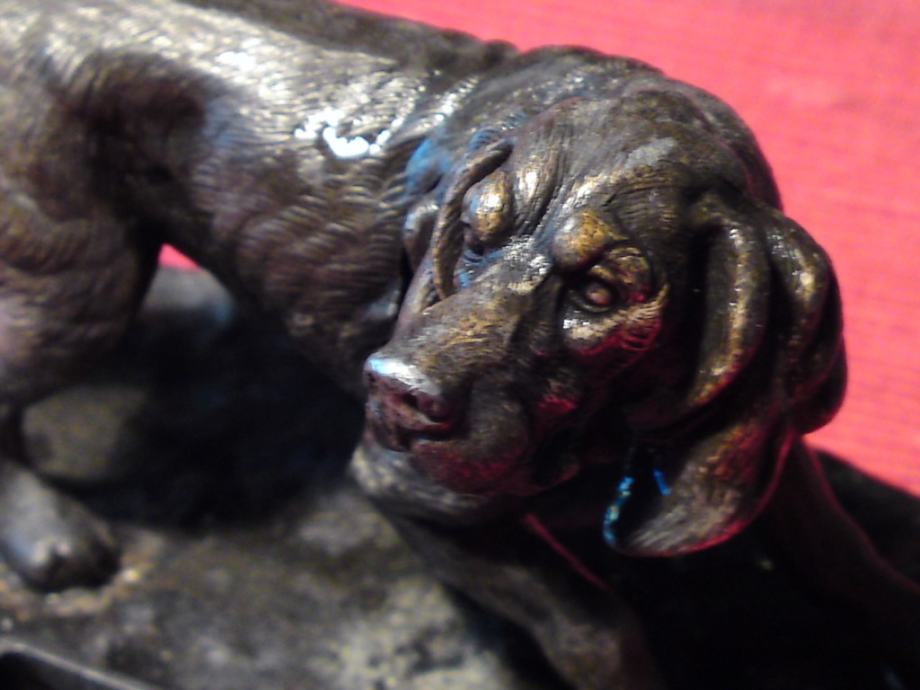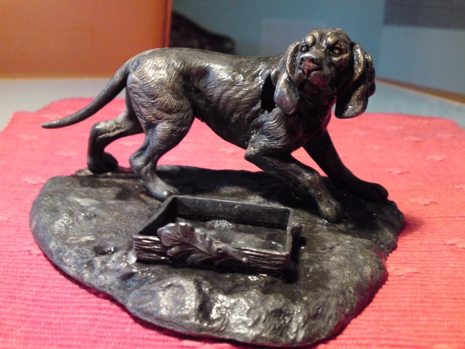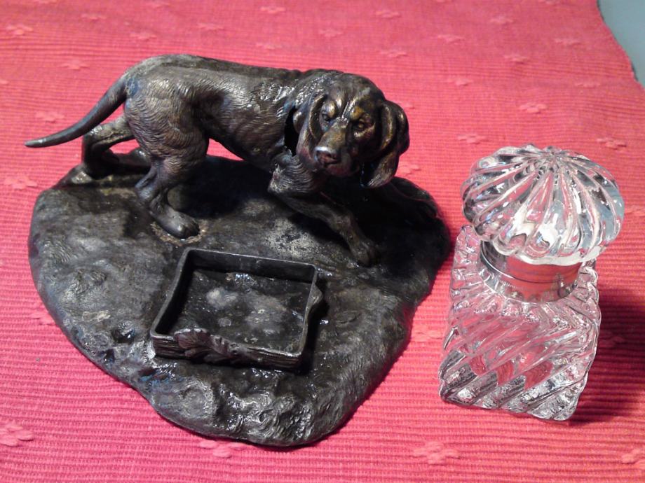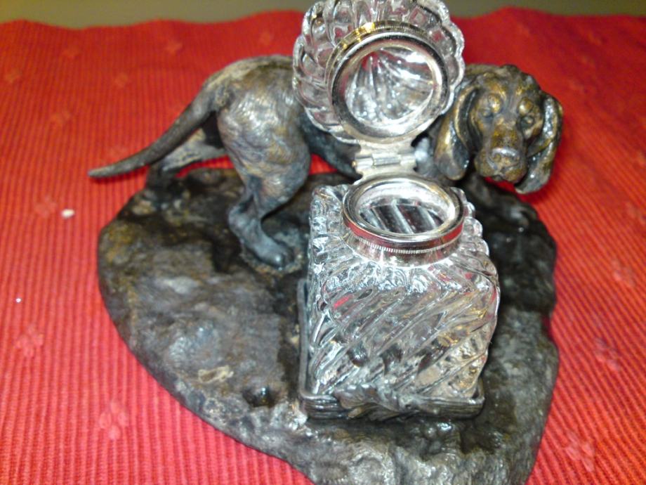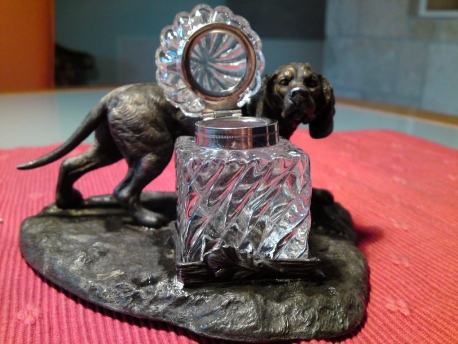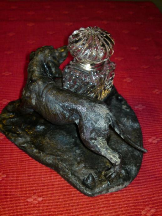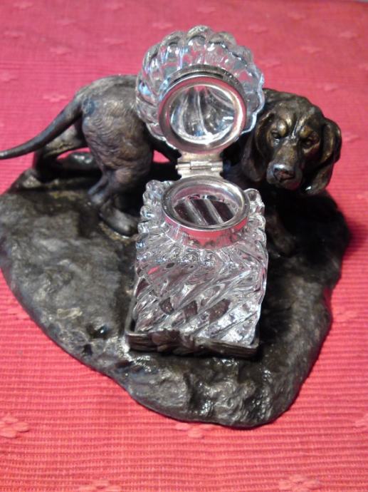 Secesijska tintarnica - figura psa od bronce, sa kristalnom posudom za tintu. Oznake secesije na dijelu stope za kristalnu posudu.