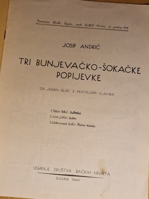 Tri Bunjevačko-Šokačke popijevke Josip Andrić 1940. Note s riječima