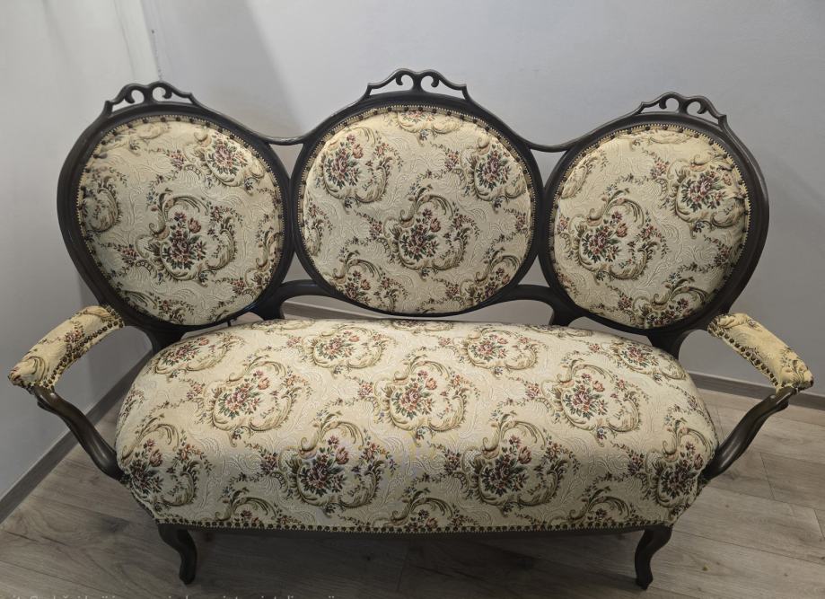 Stolica i trosjed na slici su stilu Louis XVI (Luj XVI), koji se nazivaju još medaljonom zbog ovalnog naslona za leđa. Ovaj stil potječe iz Francuske s kraja 18. stoljeća i prepoznatljiv je po elegantnom, neoklasičnom dizajnu i ravnim linijama.