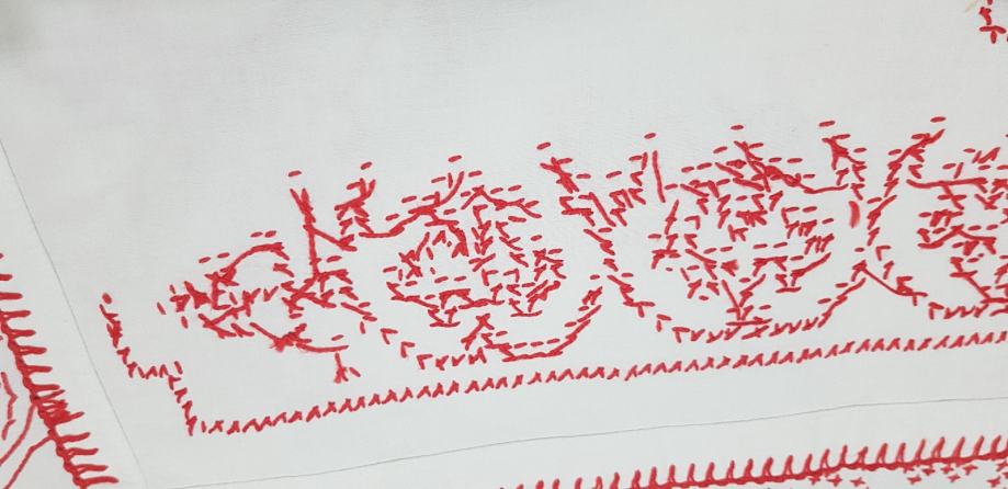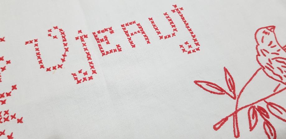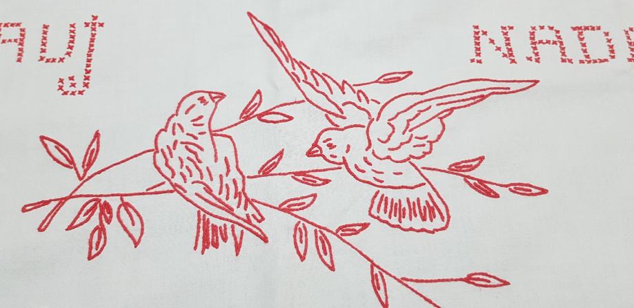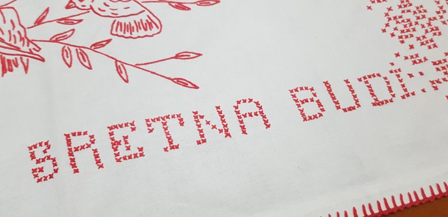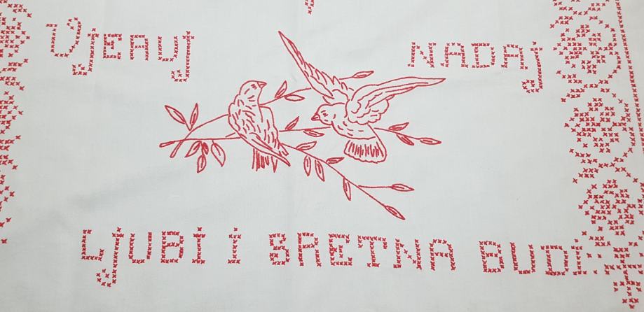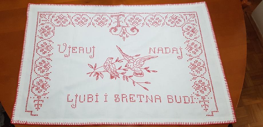 Stara super očuvana ukrasna krpa za zid.Rucno vezena VJERUJ,NADAJ,LJUBI I SRETNA BUDI