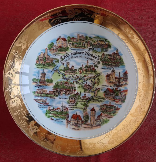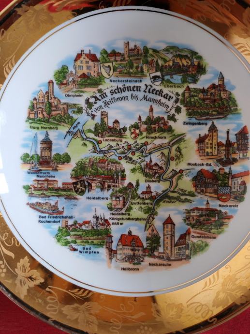 Ukrasna zdjelica promjera 20cm,sa motivima gradova uz rijeku Neckar, od Bavaria porculana sa pozlatom.